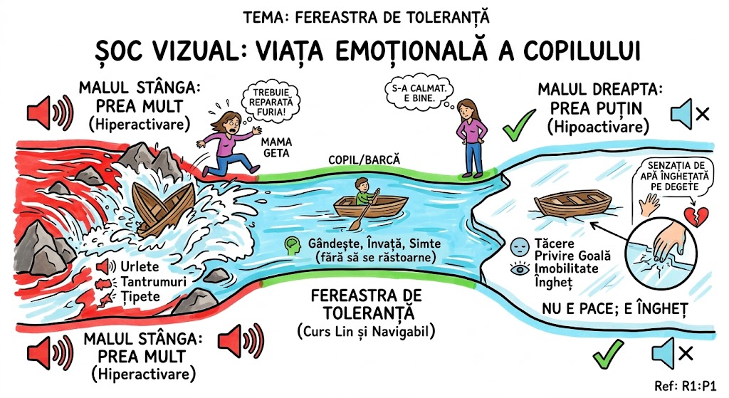 Imagineaza-ti viata emotionala a copilului ca un rau. Malul din stanga e "Prea Mult" β hiperactivare β repezisuri, apa alba, stanci, urlete. Malul din dreapta e "Prea Putin" β hipoactivare β lac inghetat, tacere, privire goala, imobilitate. Intre maluri curge cursul lin si navigabil β Fereastra de Toleranta β unde barca (copilul) poate vaSli, poate gandi, poate invata, poate simti fara sa se rastoarne. Mama Geta se concentra obsesiv pe malul din stanga β pe repezisuri (urletele, tantrumurile, tipetele). De fiecare data cand copilul "intra in repezis", saREA dupa el. Dar nu vedea niciodata malul din dreapta β momentele in care copilul statea tacut in camera, cu privirea goala, nemiscat. Credea ca "tacerea" = "s-a calmat". De fapt, barca trecuse de la repezisuri la lac inghetat β la fel de "in afara ferestrei", dar fara zgomot. Sunetul apei care trece de la repezisuri la lac inghetat e un sunet care scade gradual pana la liniste completa β si acea liniste nu e pace; e inghet. Senzatia de apa inghetatA pe degete β acel contact care iti taie respiratia β e ce simte un copil in hipoactivare: nu simte "nimic", dar "nimicul" ala doare.