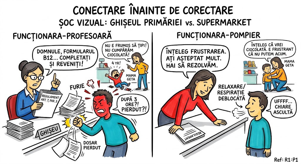 Imagineaza-ti o scena la ghiseul primariei. Un cetatean sta la coada de 3 ore. Dosarul lui s-a pierdut. Acum e la ghiseu, rosu la fata, cu vocea tremuranad. Functionara-Profesoara deschide regulamentul, ridica degetul si incepe: "Domnule, conform articolului 7, paragraful 3, trebuie sa completati formularul B12 in dublu exemplar si sa reveniti cu..." β cetateanul loveste cu pumnul in ghiseu. Mama Geta era Functionara-Profesoara cand copilul ei de 4 ani urla in supermarket pentru o ciocolata. Deschidea "regulamentul": "Nu e frumos sa tipi! Oamenii se uita! Nu cumparam ciocolata marti! Ti-am explicat de 100 de ori!" Copilul β al carui "ghiseu" emotional era blocat, cu un dosar pierdut pe care nu stia sa-l explice β urla si mai tare. Dar Functionara-Pompier face altfel: ignora regulamentul, se apleaca peste ghiseu si spune cu voce calma: "Inteleg. Ati asteptat foarte mult si asta e incredibil de frustrant. Hai sa vedem cum rezolvam." Cetateanul inspira adanc β se aude sunetul acela al respiratiei care se deblocheaza, ca un balon care se dezumfla lent. ABIA ATUNCI, dupa ce furia s-a consumat, Functionara deschide regulamentul si explica procedura. Si cetateanul chiar asculta.