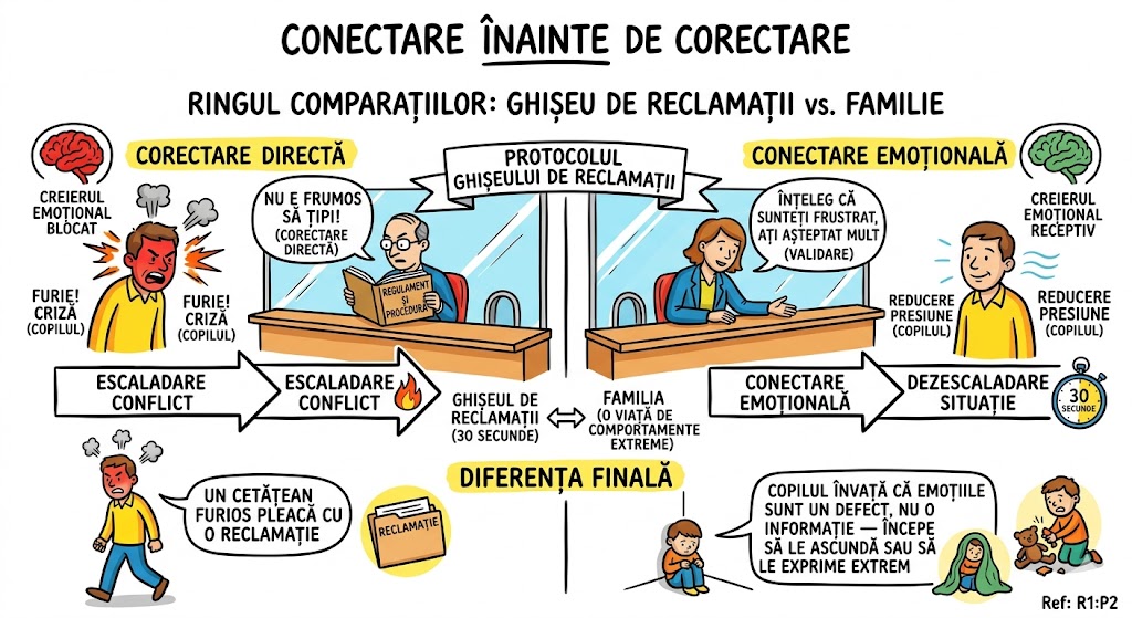 π₯ Ringul Comparatiilor: "Conectare inainte de Corectare" in relatia cu copilul functioneaza exact ca protocolul de la un ghiseu de reclamatii: cand un cetatean vine furios (copilul in criza), functionarul care incepe cu regulamentul si procedura (corectare directa β "Nu e frumos sa tipi!") escaladeaza conflictul garantat, pentru ca cetateanul nu aude regulile cand e in plina furie β creierul lui emotional a preluat controlul complet. Functionarul care incepe cu "Inteleg ca sunteti frustrat, ati asteptat mult" (conectare emotionala β validarea) dezescaladeaza situatia in 30 de secunde, pentru ca furia, odata "vazuta" si recunoscuta, isi pierde din presiune. Diferenta: la ghiseu, un cetatean furios pleaca cu o reclamatie. In familie, un copil care primeste repetat "corectare fara conectare" invata ca emotiile lui sunt un defect, nu o informatie β si incepe sa le ascunda sau sa le exprime prin comportamente din ce in ce mai extreme.