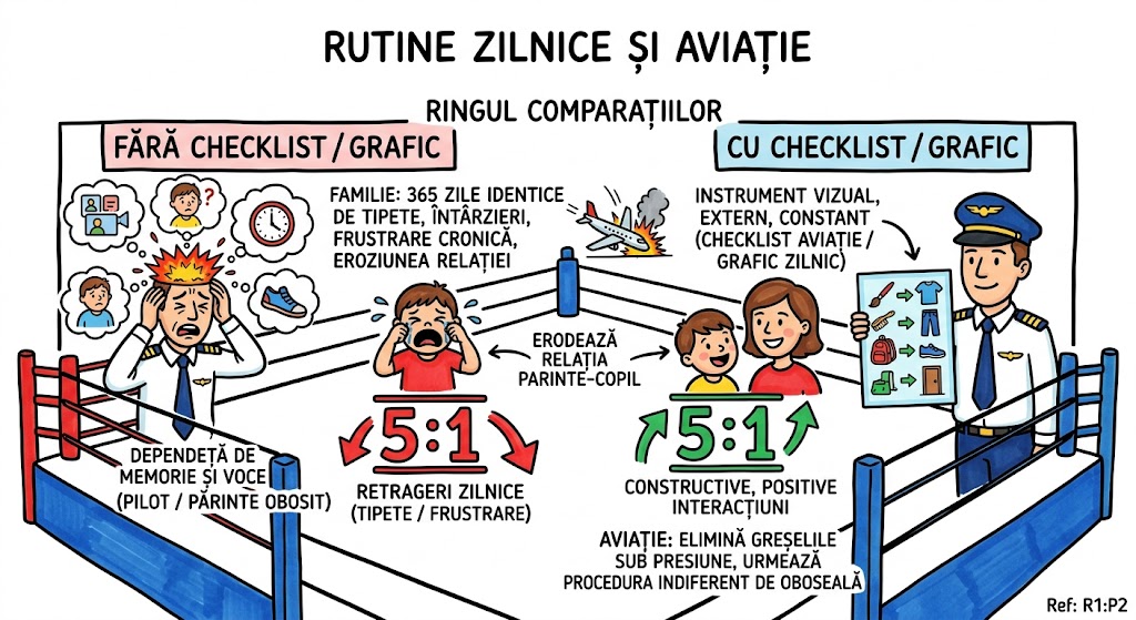 π₯ Ringul Comparatiilor: Graficele de rutina in familie functioneaza exact ca Pre-Flight Checklist-ul in aviatie: elimina dependenta de memoria si vocea pilotului (parintelui) si o inlocuiesc cu un instrument vizual, extern, constant. Un pilot care tine checklistul in cap face greseli sub presiune (exact cum un parinte obosit la 7 dimineata uita pasii sau ii urla in ordine gresita). Un pilot cu checklist pe hartie urmeaza procedura indiferent de cat de obosit e. Diferenta: in aviatie, lipsa checklistului cauzeaza accidente. In familie, lipsa graficului nu cauzeaza accidente β cauzeaza 365 de diminetiI identice de tipete, intarzieri si frustrare cronica care erodeaza relatia parinte-copil, exact ca retragerile zilnice din contul 5:1 (p1).