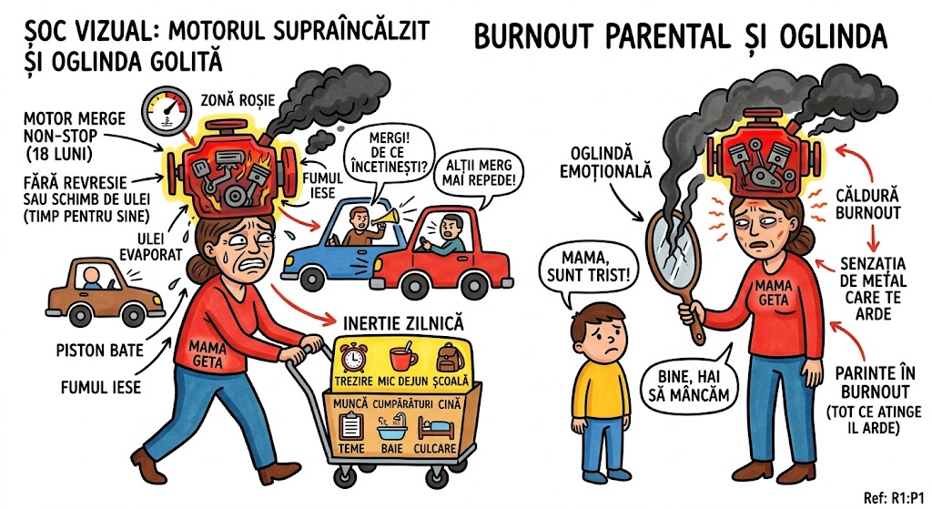 Imagineaza-ti un motor de masina care merge non-stop de 18 luni fara revizie, fara schimb de ulei, fara oprire. Turometrul e constant in zona rosie. Uleiul s-a evaporat. Pistonul bate. Fumul iese pe sub capota. Soferii din spate claxoneaza: "Mergi! De ce incetinesti? Altii merg mai repede!" Motorul nu e "lenes". Nu "nu vrea". Nu mai POATE. Mama Geta era acel motor. In fiecare dimineata se pornea pe inertie β trezire, mic dejun, imbracat, scoala, munca, cumparaturi, cina, teme, baie, culcare β fara o secunda de oprire, fara "schimb de ulei" (timp pentru ea), fara "revizie" (suport din exterior). Cand copilul venea cu o emotie ("Mama, sunt trist!"), ea raspundea: "Bine, hai sa mancam" β nu din rautate, ci din gol. Nu mai avea ce sa reflecte in "Oglinda" (p13) β oglinda era fumurie de la fumul motorului. Senzatia de metal care se incalzeste sub degete β acel avertisment termic care te face sa retragi mana β e ce simte parintele in burnout: tot ce atinge il arde, si tot ce atinge arde.