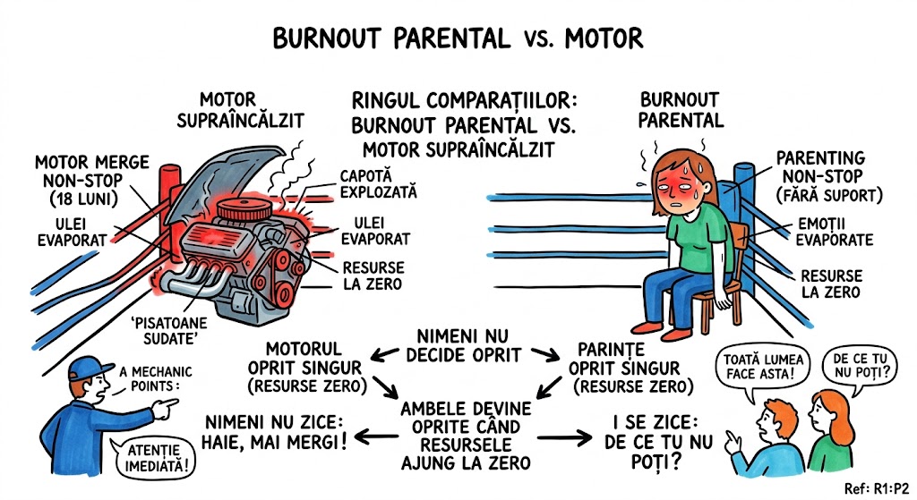 π₯ Ringul Comparatiilor: Burnout-ul parental functioneaza exact ca un motor supraincalzit: un motor care merge non-stop fara ulei, fara oprire si fara revizie nu "decide" sa se opreasca β SE OPRESTE singur cand temperatura depaseste limita (capota explodeaza, pistoanele se sudeaza). In parenting, parintele in burnout nu "decide" sa devina distant sau ineficient β DEVINE cand resursele ajung la zero. Diferenta: un motor supraincalzit primeste imediat atentie β nimeni nu-i spune "hai, mai mergi putin". Un parinte in burnout este de obicei ignorat β sau, mai rau, i se spune "Dar toata lumea face asta, de ce TU nu poti?" (invalidare, p18 aplicatA la adult). Si fix asta agraveaza burnout-ul: nu doar epuizarea, ci si sentimentul ca "nu am voie sa fiu epuizat."