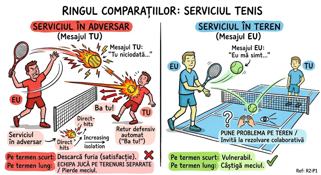 π₯ Ringul Comparatiilor: Mesajele "Eu" vs. "Tu" functioneaza exact ca diferenta dintre doua servicii la tenis: serviciul direct in adversar (Mesajul Tu β "Tu niciodata nu faci!") si serviciul in teren (Mesajul Eu β "Eu ma simt... cand... pentru ca..."). Primul loveste persoana si genereaza un retur defensiv automat ("Ba tu!"). Al doilea pune problema PE TEREN, intre voi, si invita la rezolvare colaborativa. Serviciul in adversar e mai rapid si mai satisfacator in moment (descarca furia), dar pierde meciul pe termen lung. Serviciul in teren e mai lent si mai vulnerabil (recunosti ca simti ceva), dar castiga meciul. Diferenta critica: la tenis, adversarul e pe cealalta parte a fileului. In familie, "adversarul" este persoana cu care dormi β si fiecare serviciu direct in el il departamenteaza putin mai mult, pana cand "echipa" ajunge sa joace pe terenuri separate.