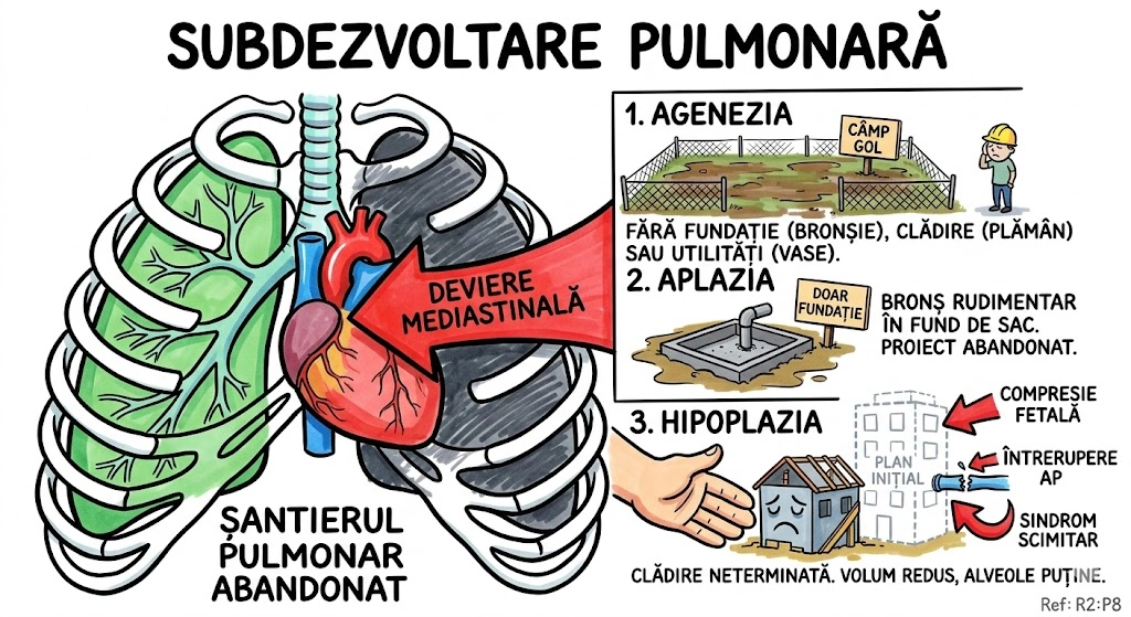 Trei nivele de abandon pe un santier de constructii. Nivelul 1 — Terenul Gol (Agenezia): nu exista nimic — nici fundatie (bronsii), nici cladire (plaman), nici utilitati (vascularizatie). Nivelul 2 — Fundatia Turnata (Aplazia): cineva a turnat fundatia (brons rudimentar) si a plecat — bronsul exista dar se termina in fund de sac. Nicio cladire, nicio apa, niciun curent. Nivelul 3 — Cladire Neterminata (Hipoplazia): cladirea exista dar e mult mai mica decat planul initial — mai putine camere (alveole) si mai putine etaje (ramificatii bronsice). De ce? Planul a fost stricat de: (a) vecinul care a deviat canalizarea (sindromul scimitar), (b) conducta principala de apa a fost taiata (intrerupere proximala AP), (c) copilul din burta (fatul) a fost presat de o hernie diafragmatica sau n-a avut suficient lichid amniotic (oligohidramnios). Pe radiografie si CT: hemitoracele afectat e opac, mediastinul deviat masiv, inima dislocata posterior in hemitoracele afectat.