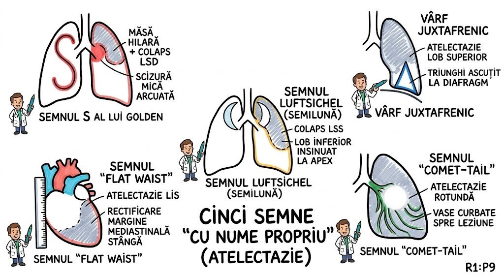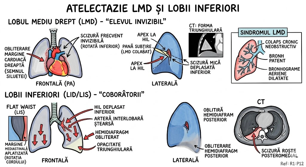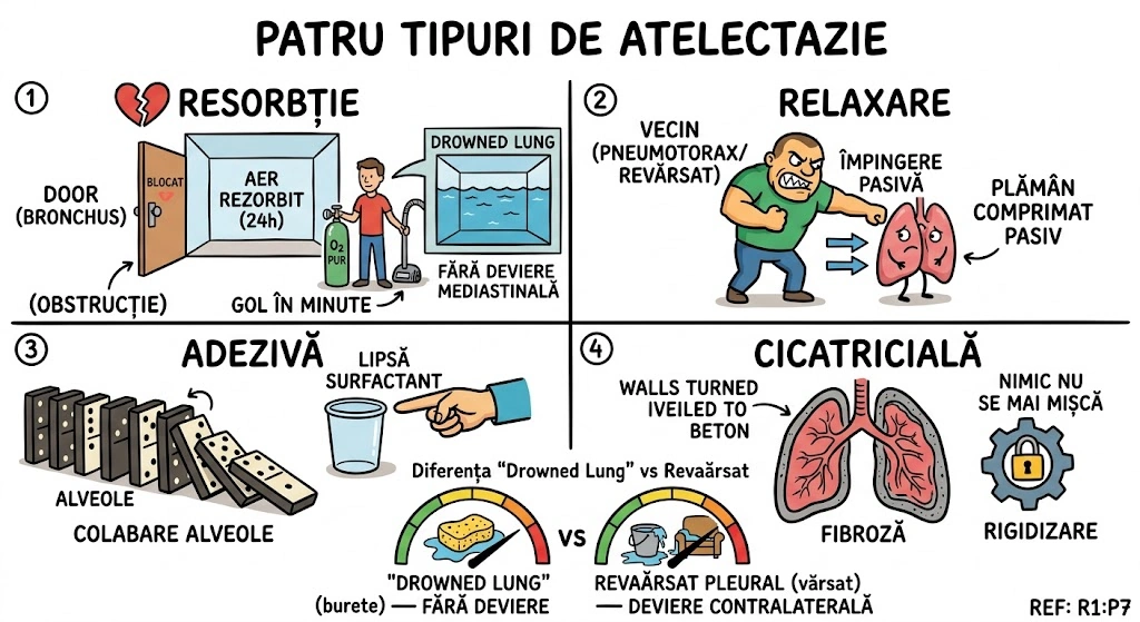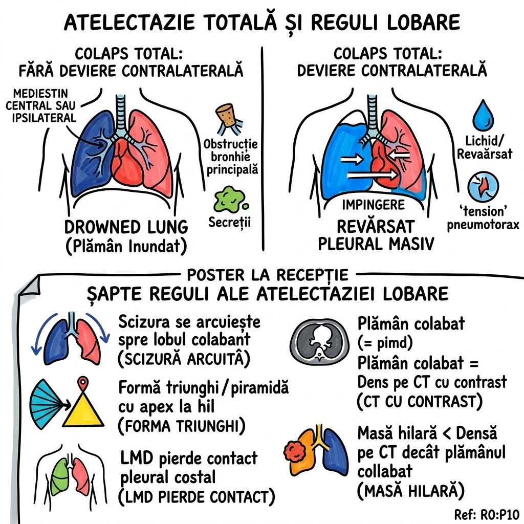 Ce Memoram: Doua fenomene fundamentale — consolidarea (aerul alveolar inlocuit cu lichid, sange, puroi, celule) si atelectazia (pierdere de volum pulmonar). Ambele produc opacitate pe radiografie, dar se deosebesc prin volumul pulmonar: pastrat in consolidare, scazut in atelectazie.