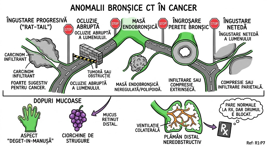 Ce Memoram: Trei anomalii bronsice cu incidenta de 0,1%: (1) Bronsul Traheal ("pig bronchus") — ia nastere din peretele traheal drept la ≤2 cm de bifurcatia traheala, alimenteaza apicalul lobului superior drept; (2) BCA — din bronsul intermediar, merge inferior si medial spre cord, de regula descoperire incidentala; (3) Izomerismul Bronsic — simetrie bilaterala, bilateral drept = asplenie, bilateral stang = polisplenie.
