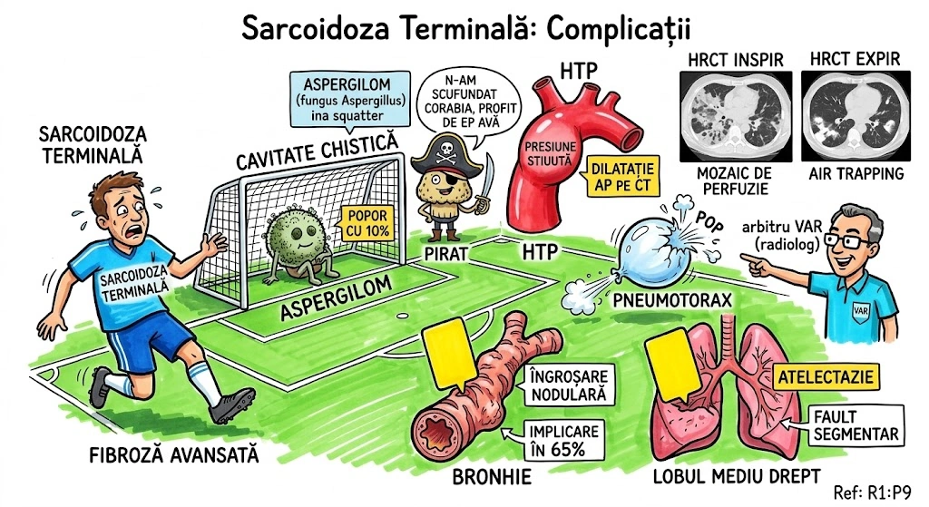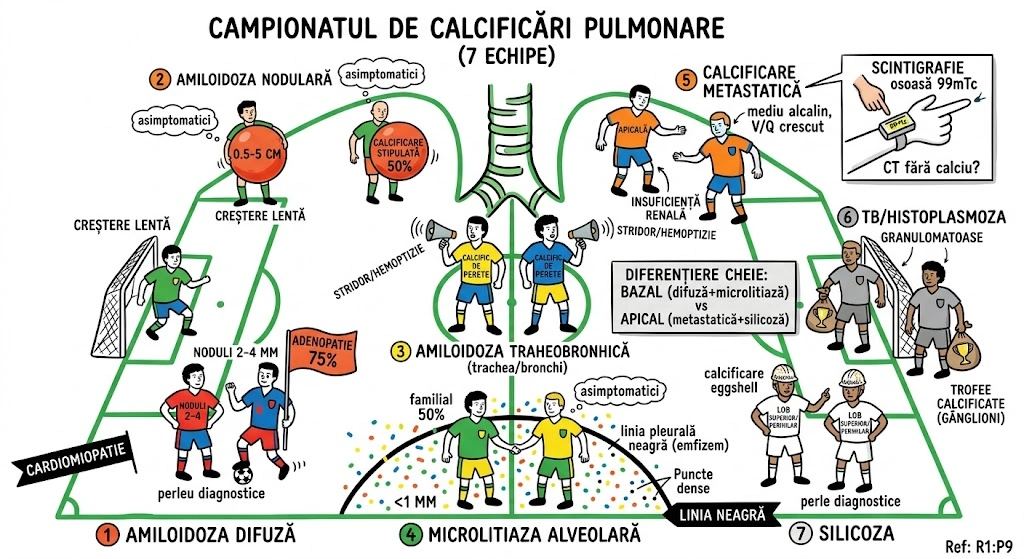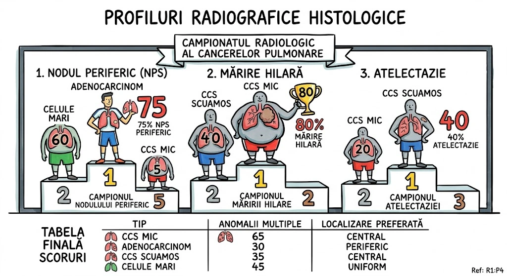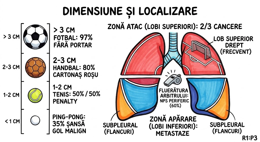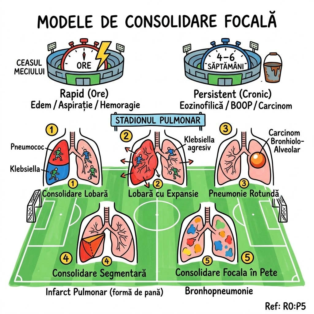 Tabloul de scor de pe stadionul pulmonar. Antrenorul Pneumococ prefera atac lobar clasic — un singur lob, ocupat complet. Antrenorul Klebsiella e mai agresiv — ocupa lobul si il expandeaza pana scizurile se bombeaza sub presiune. Carcinomul bronhiolo-alveolar joaca diferit — atac rotund, izolat, misterios, confundabil cu o minge uitata pe teren. Embolia cu infarct ataca pe coridor segmentar — un singur segment, forma de pana cu baza pleurala. Si cronometrul conteaza: gol inscris in minute-ore → edem, aspiratie, hemoragie. Meci care dureaza 4–6 saptamani → e meci cronic: eozinofilica, BOOP sau neoplasm.