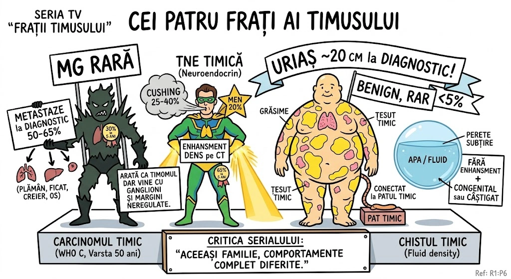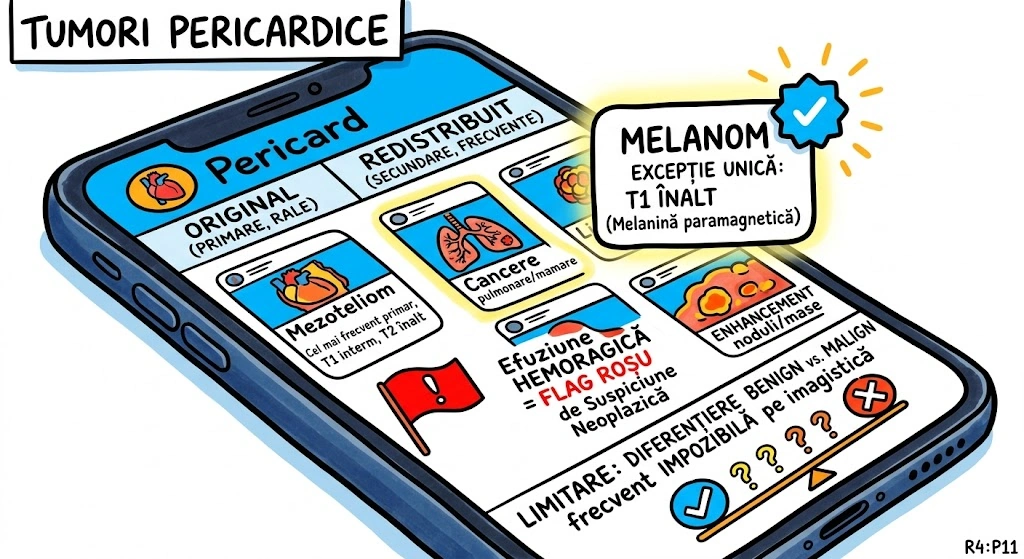 🥊 Ringul Comparatiilor: Diferentierea chist vs. tumora pericardica e similara cu verificarea daca un obiect dintr-un magazin e real sau macheta: obiectul real (tumora) reactioneaza la stimuli (enhanceaza dupa gadoliniu); macheta (chistul) arata identic dar nu reactioneaza la nimic. 40% din chisturi contin fluid proteinos care le face sa para "reale" pe T1, dar testul cu gadoliniu le demascheaza imediat.