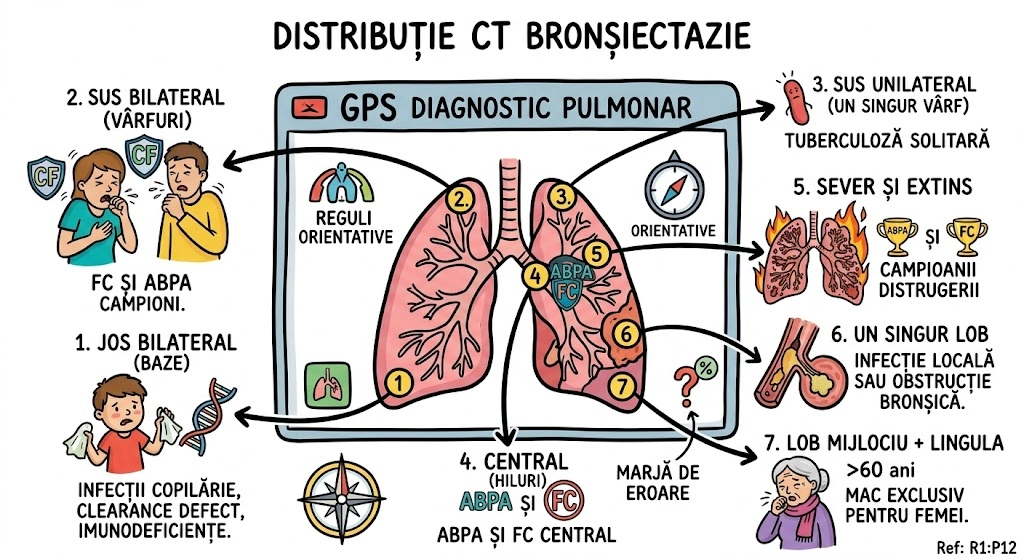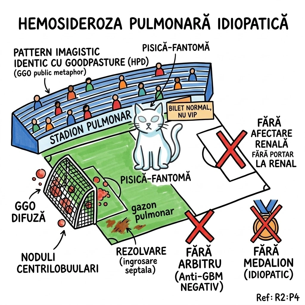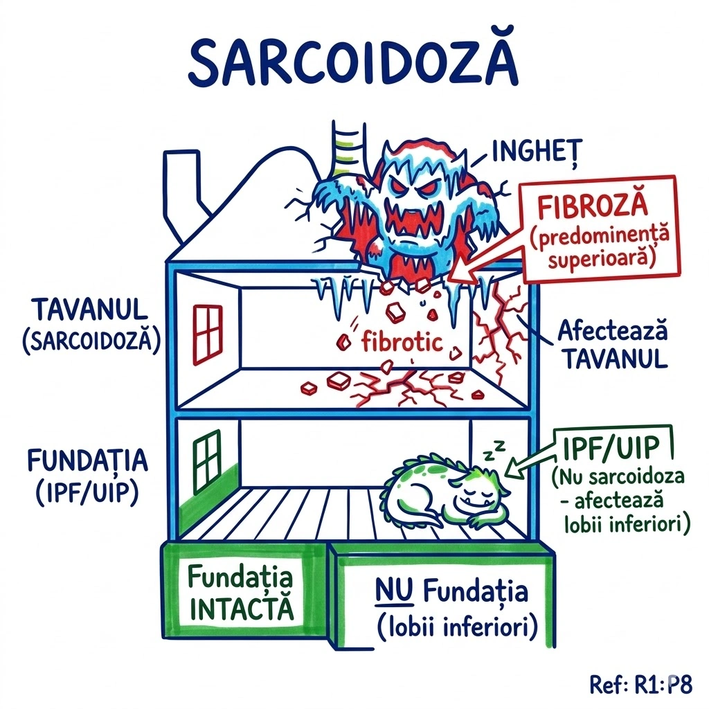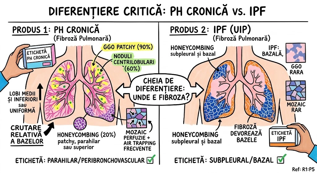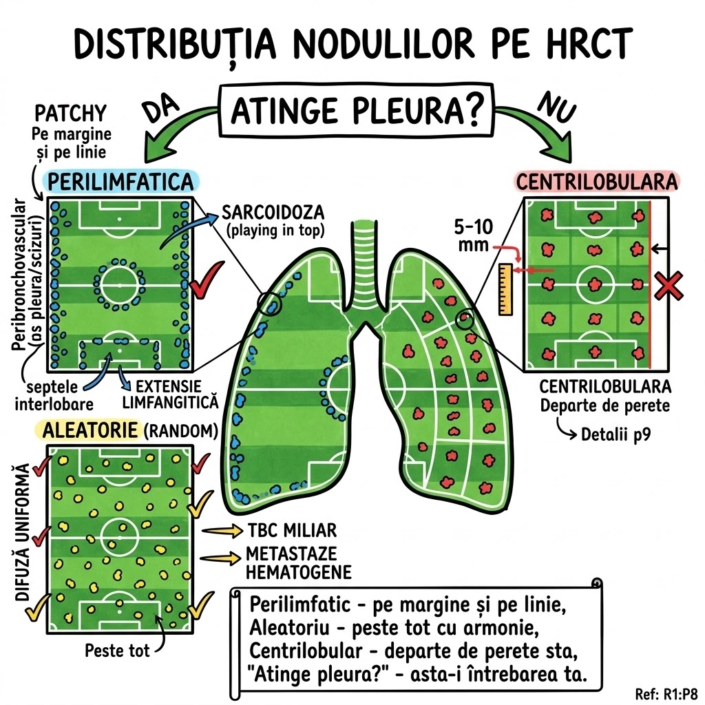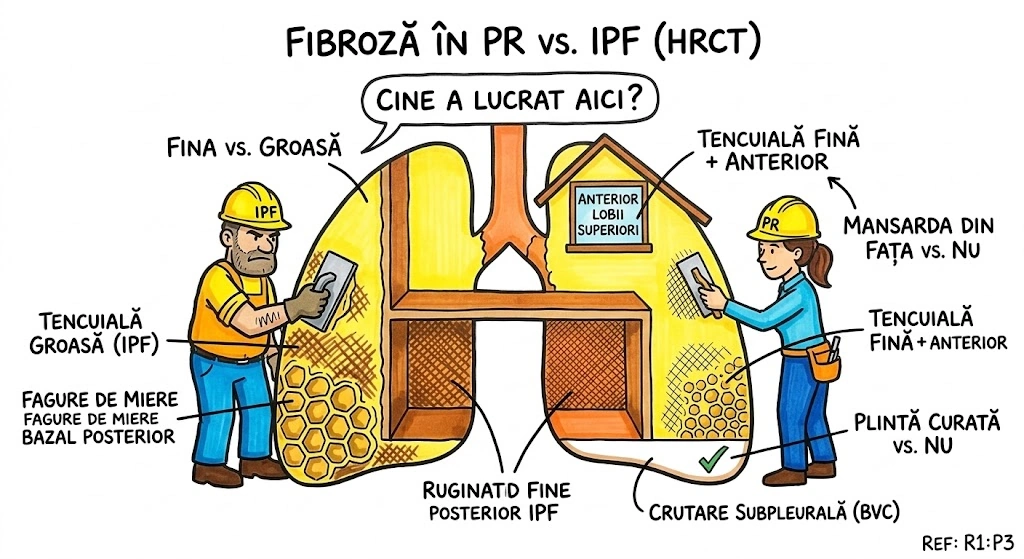 🥊 Ringul Comparatiilor: Pattern-ul bat-wing (perihilar) vs. pattern-ul periferic subpleural sunt opuse simetrice, ca doua echipe care ataca din directii opuse pe terenul de fotbal: edemul ataca din centru spre periferie (bat-wing), bolile cronice ataca din periferie spre centru (reverse bat-wing). Cand vezi pe Rx o consolidare si intrebi „de unde a inceput atacul?", raspunsul iti spune si cine ataca.