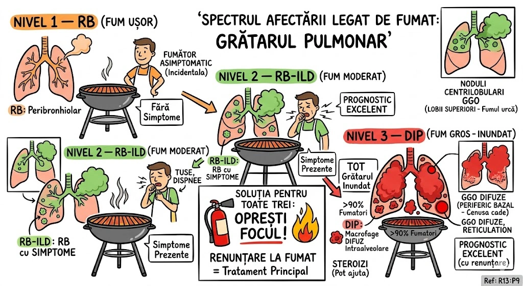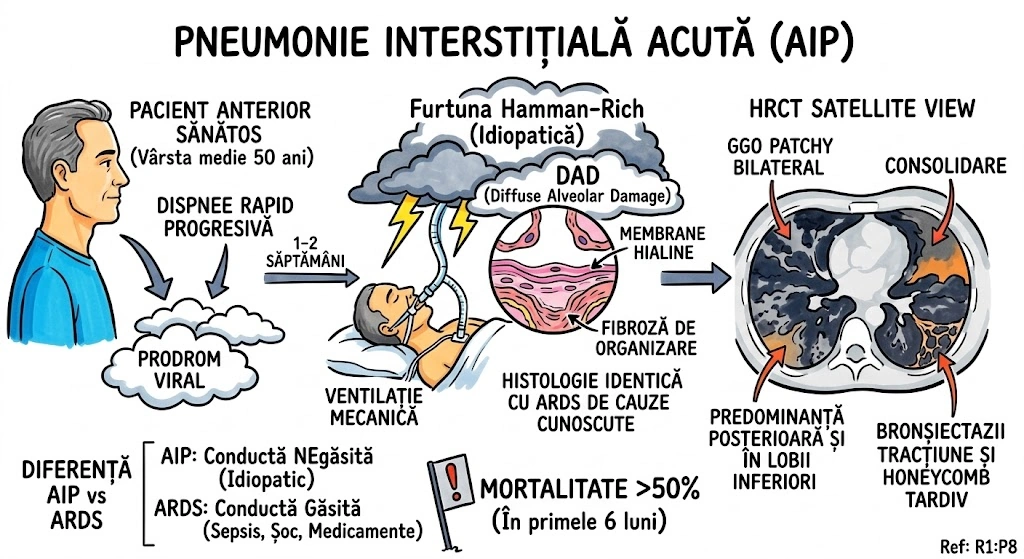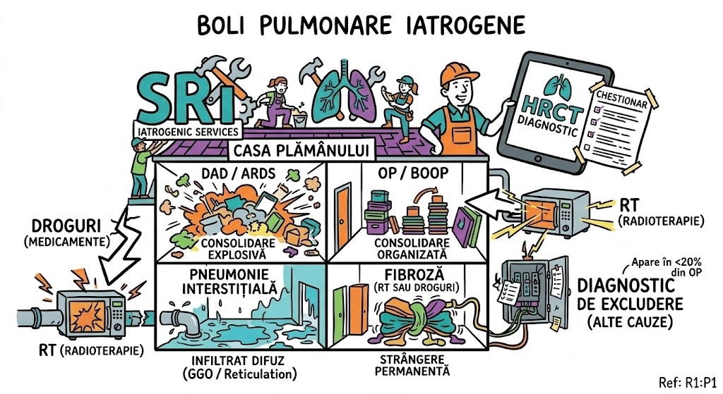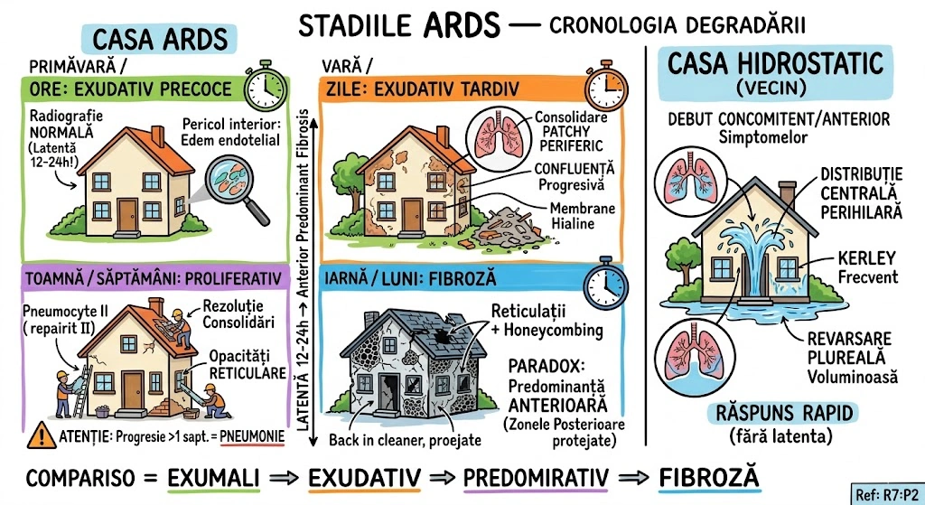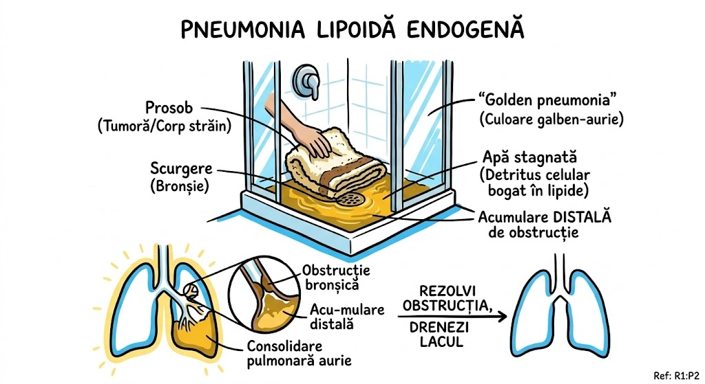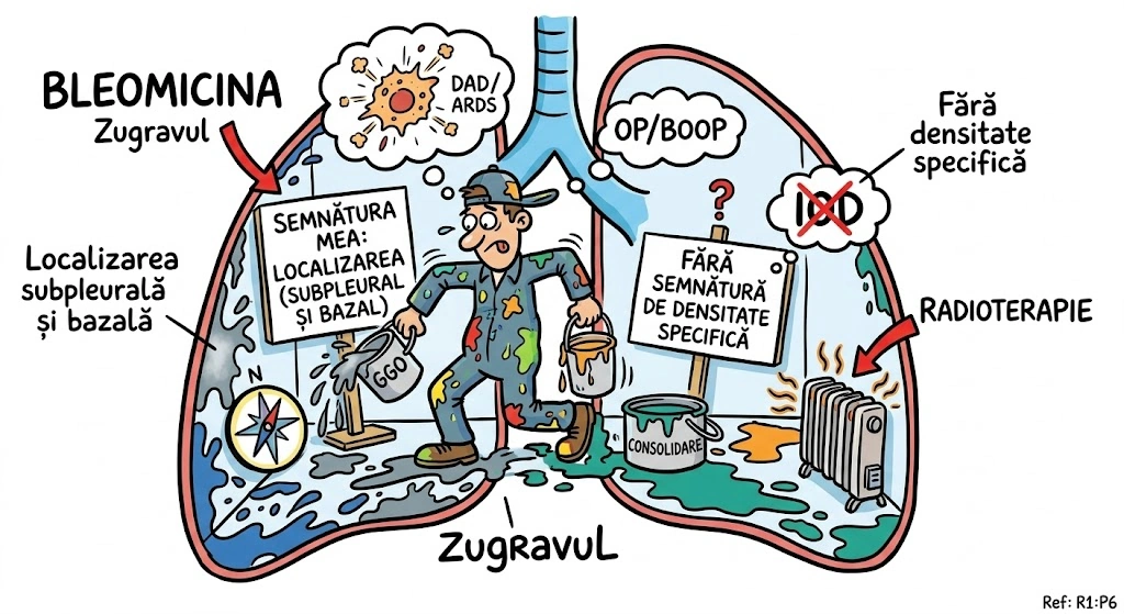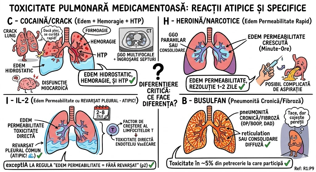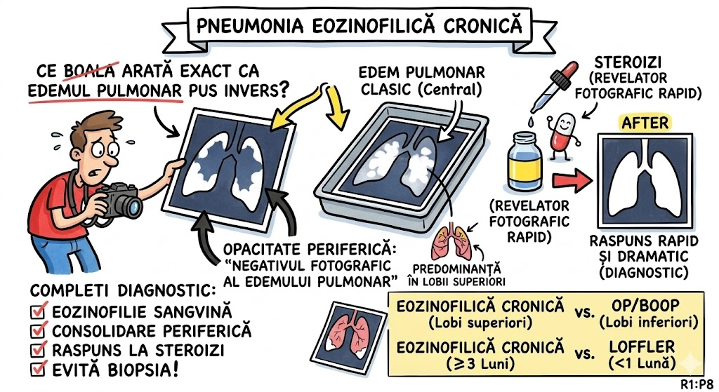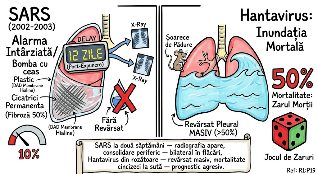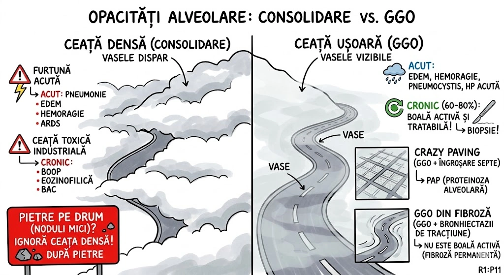 🥊 Ringul Comparatiilor: Consolidarea rapid aparuta (ore) vs. persistent cronica (4–6 saptamani) e diferenta intre un accident de masina si o rugina progresiva. Accidentul (edem, aspiratie, hemoragie) e brusc, dramatic, vizibil imediat. Rugina (eozinofilica, BOOP, carcinom) e lenta, insidioasa, descoperita intamplator. Ambele distrug masina, dar cronometrul iti spune cine e vinovatul.