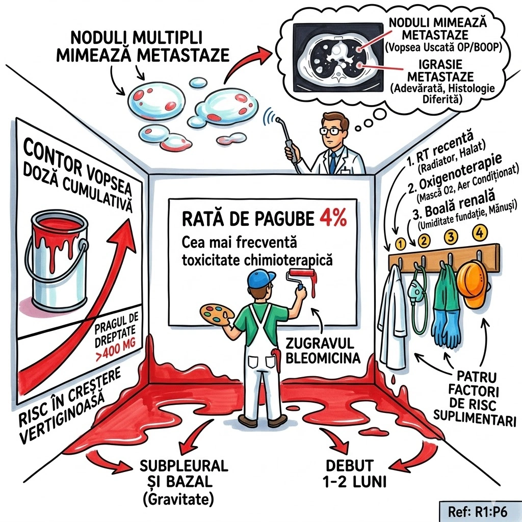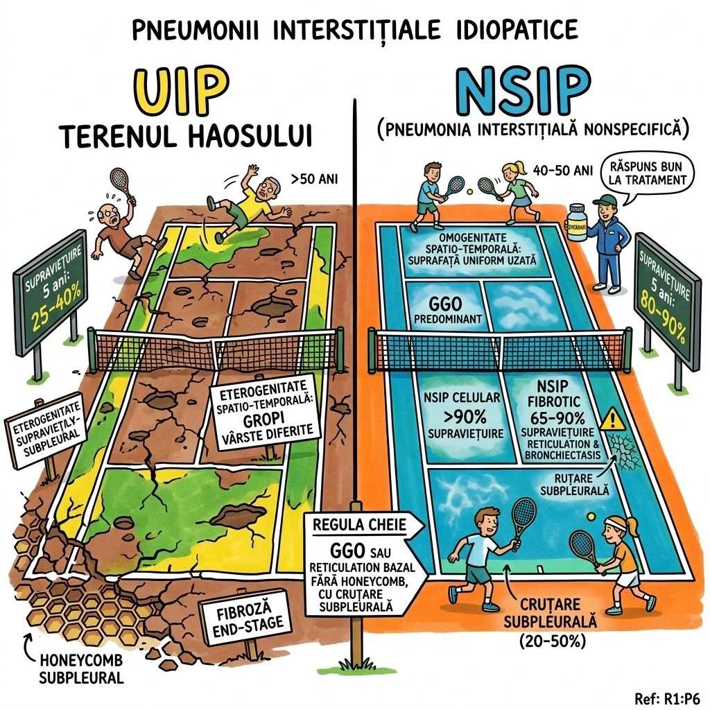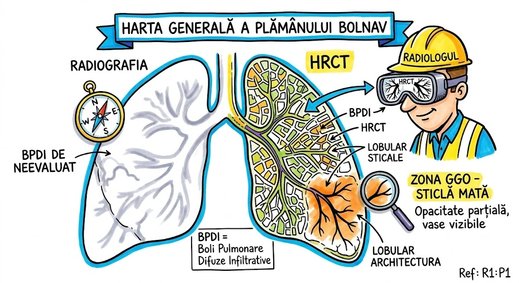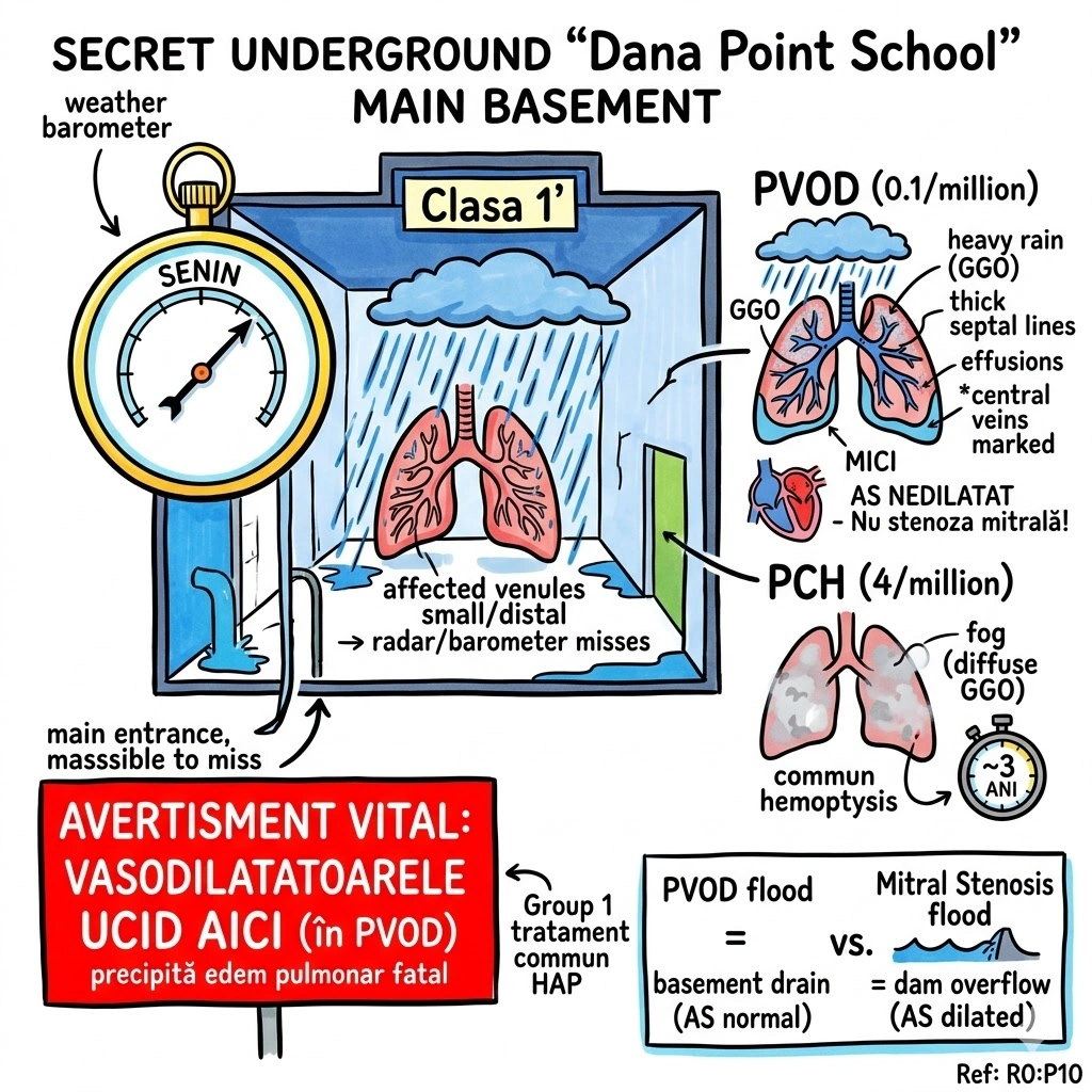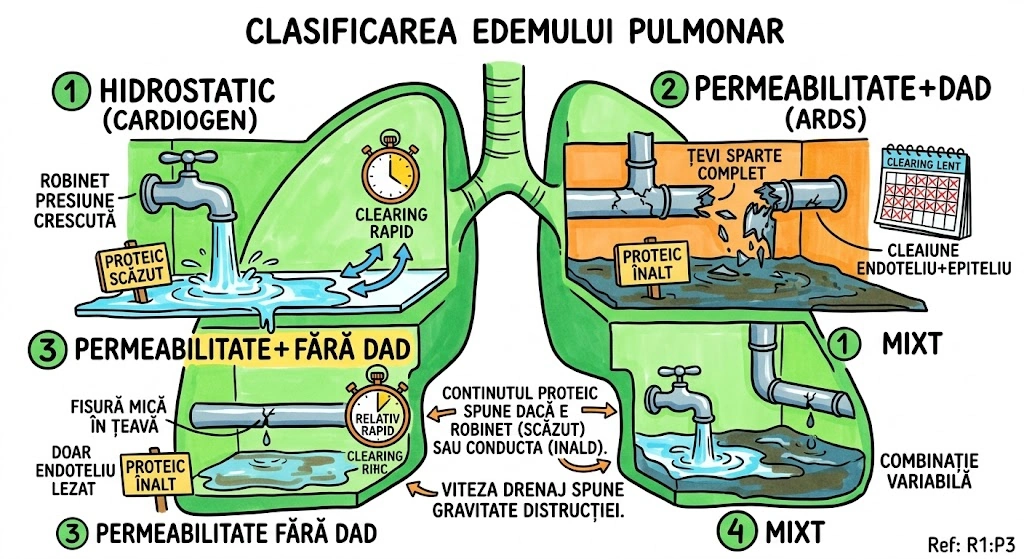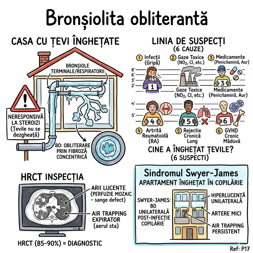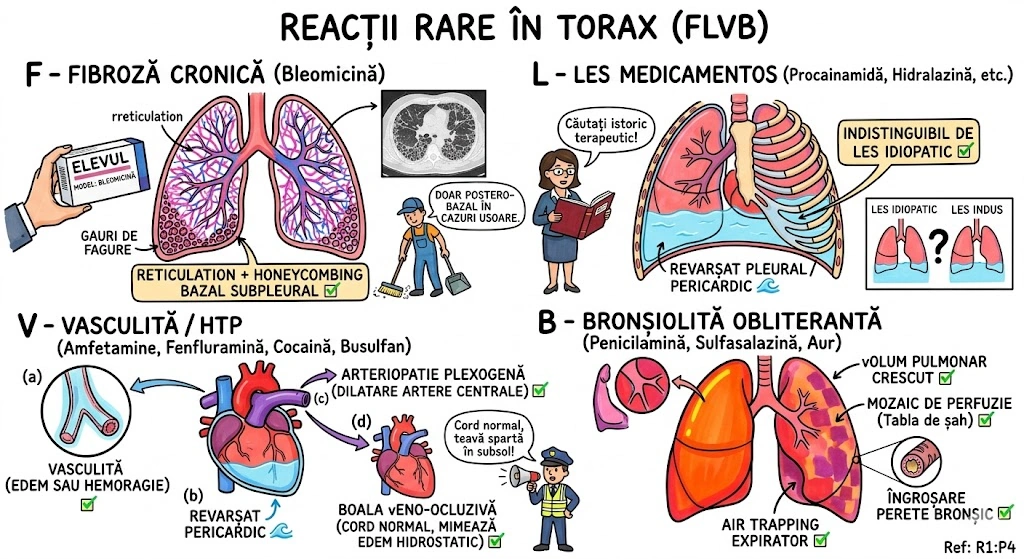 🥊 Ringul Comparatiilor: Consolidarea rapid aparuta (ore) vs. persistent cronica (4–6 saptamani) e diferenta intre un accident de masina si o rugina progresiva. Accidentul (edem, aspiratie, hemoragie) e brusc, dramatic, vizibil imediat. Rugina (eozinofilica, BOOP, carcinom) e lenta, insidioasa, descoperita intamplator. Ambele distrug masina, dar cronometrul iti spune cine e vinovatul.