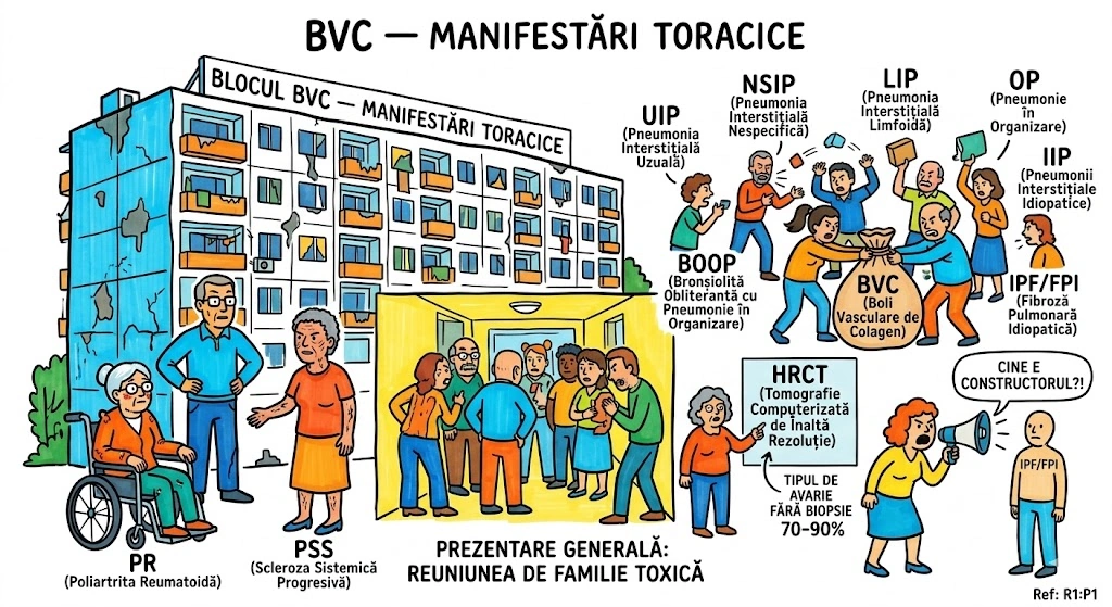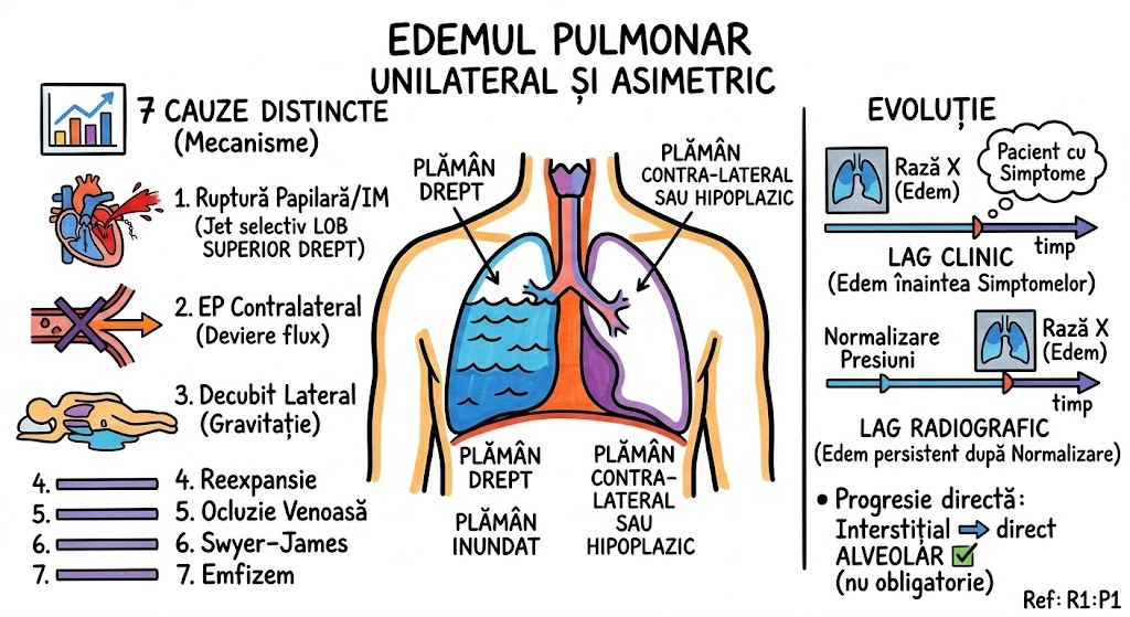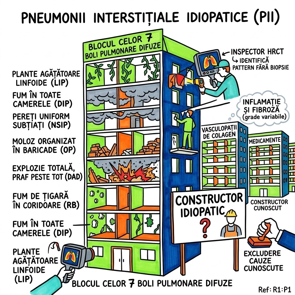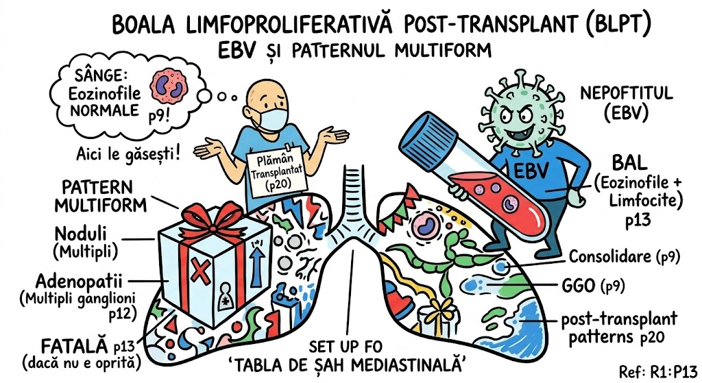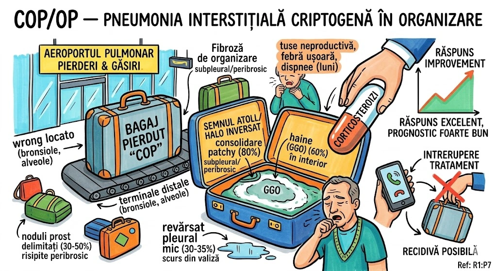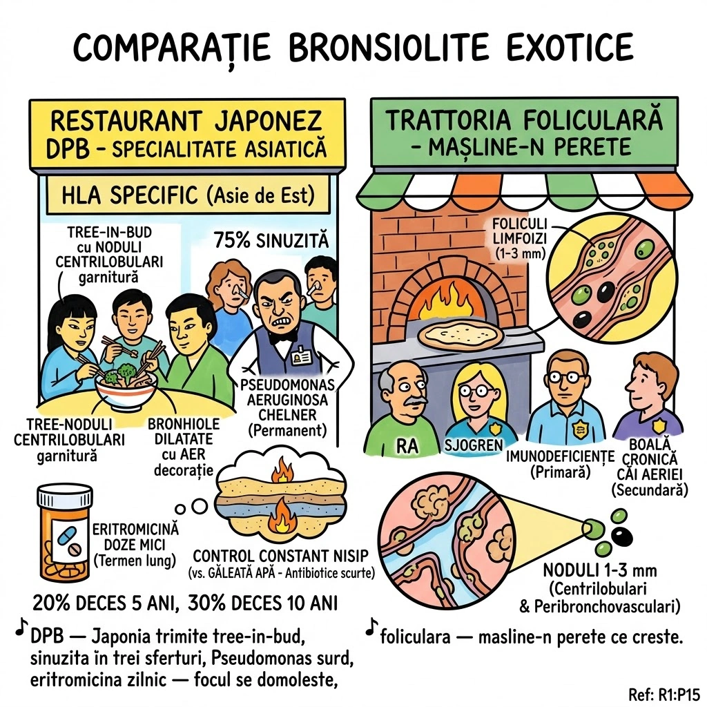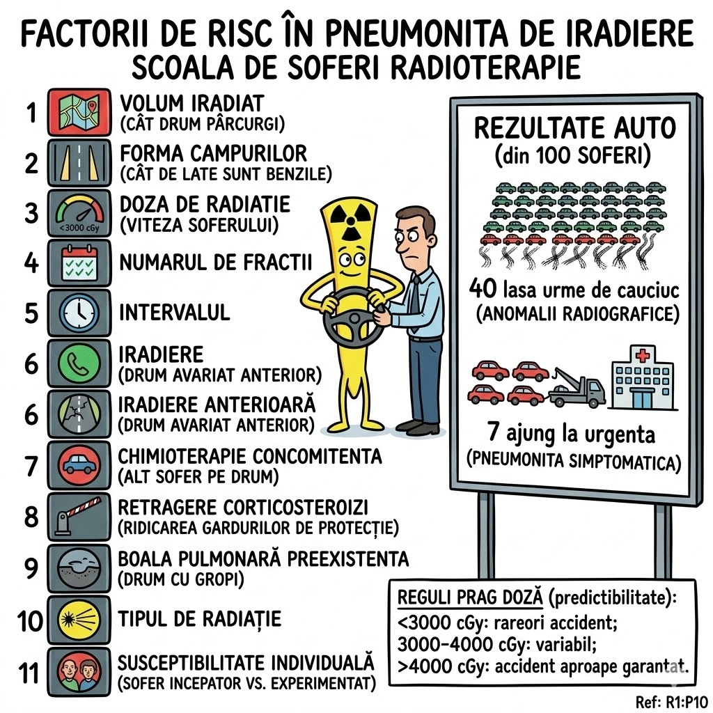 🥊 Ringul Comparatiilor: Consolidarea rapid aparuta (ore) vs. persistent cronica (4–6 saptamani) e diferenta intre un accident de masina si o rugina progresiva. Accidentul (edem, aspiratie, hemoragie) e brusc, dramatic, vizibil imediat. Rugina (eozinofilica, BOOP, carcinom) e lenta, insidioasa, descoperita intamplator. Ambele distrug masina, dar cronometrul iti spune cine e vinovatul.