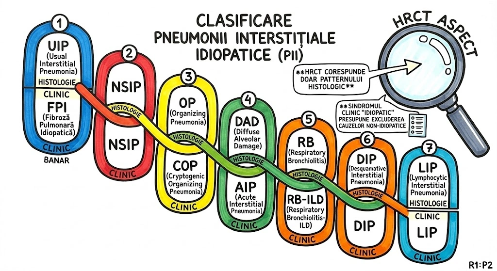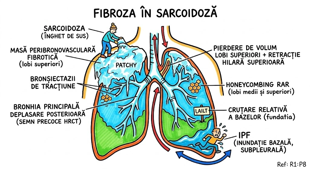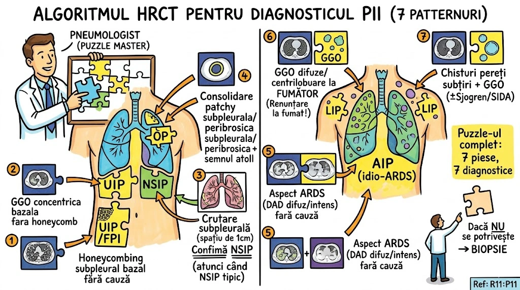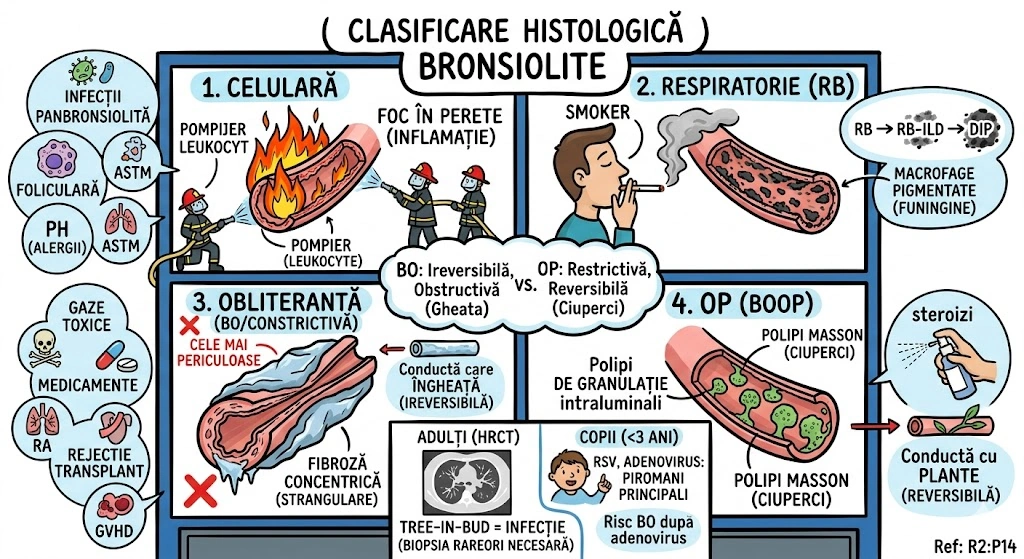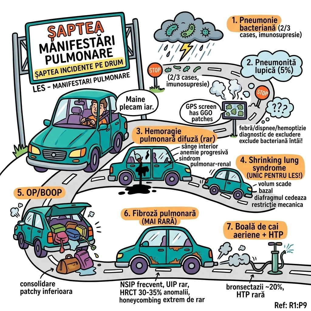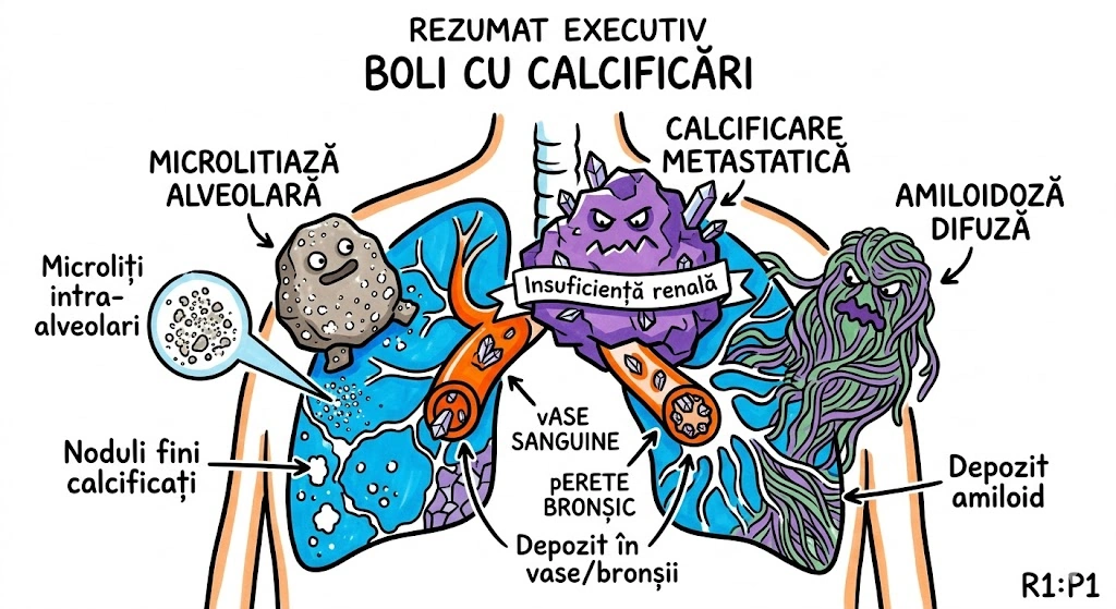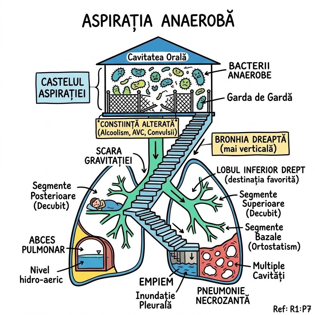 🥊 Ringul Comparatiilor: Consolidarea rapid aparuta (ore) vs. persistent cronica (4–6 saptamani) e diferenta intre un accident de masina si o rugina progresiva. Accidentul (edem, aspiratie, hemoragie) e brusc, dramatic, vizibil imediat. Rugina (eozinofilica, BOOP, carcinom) e lenta, insidioasa, descoperita intamplator. Ambele distrug masina, dar cronometrul iti spune cine e vinovatul.