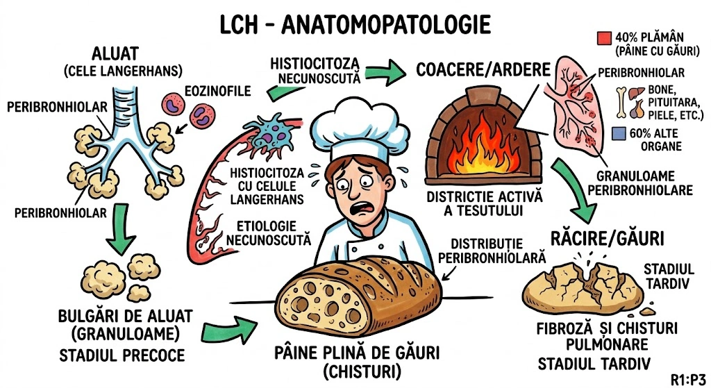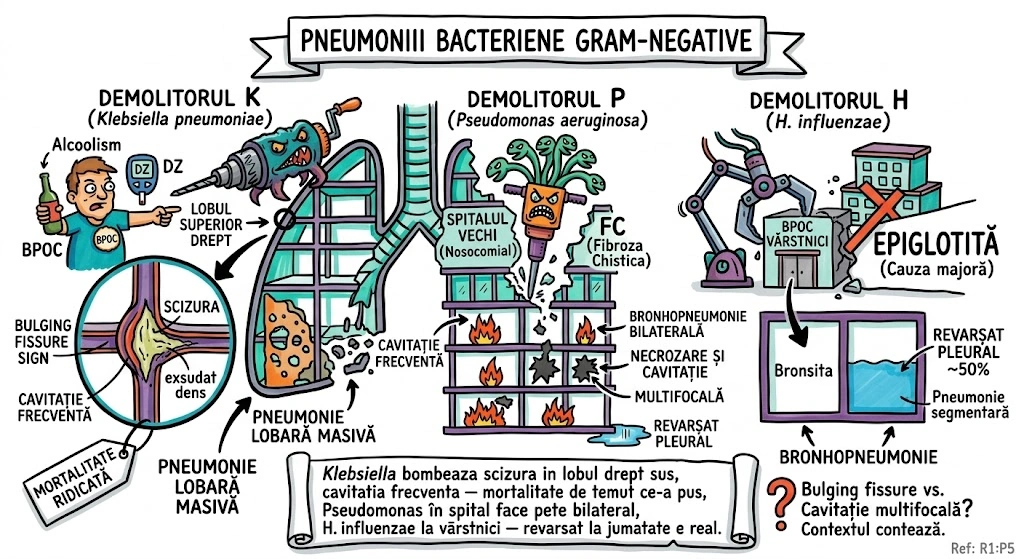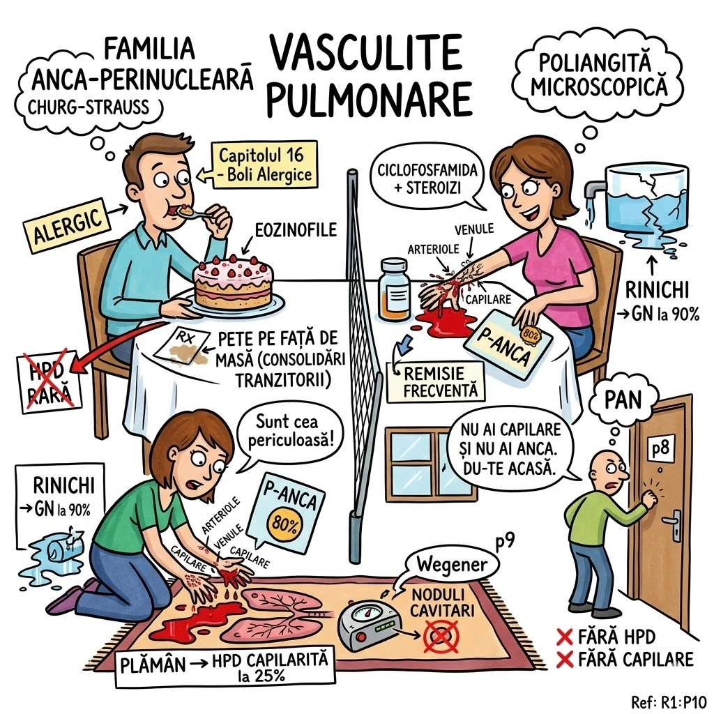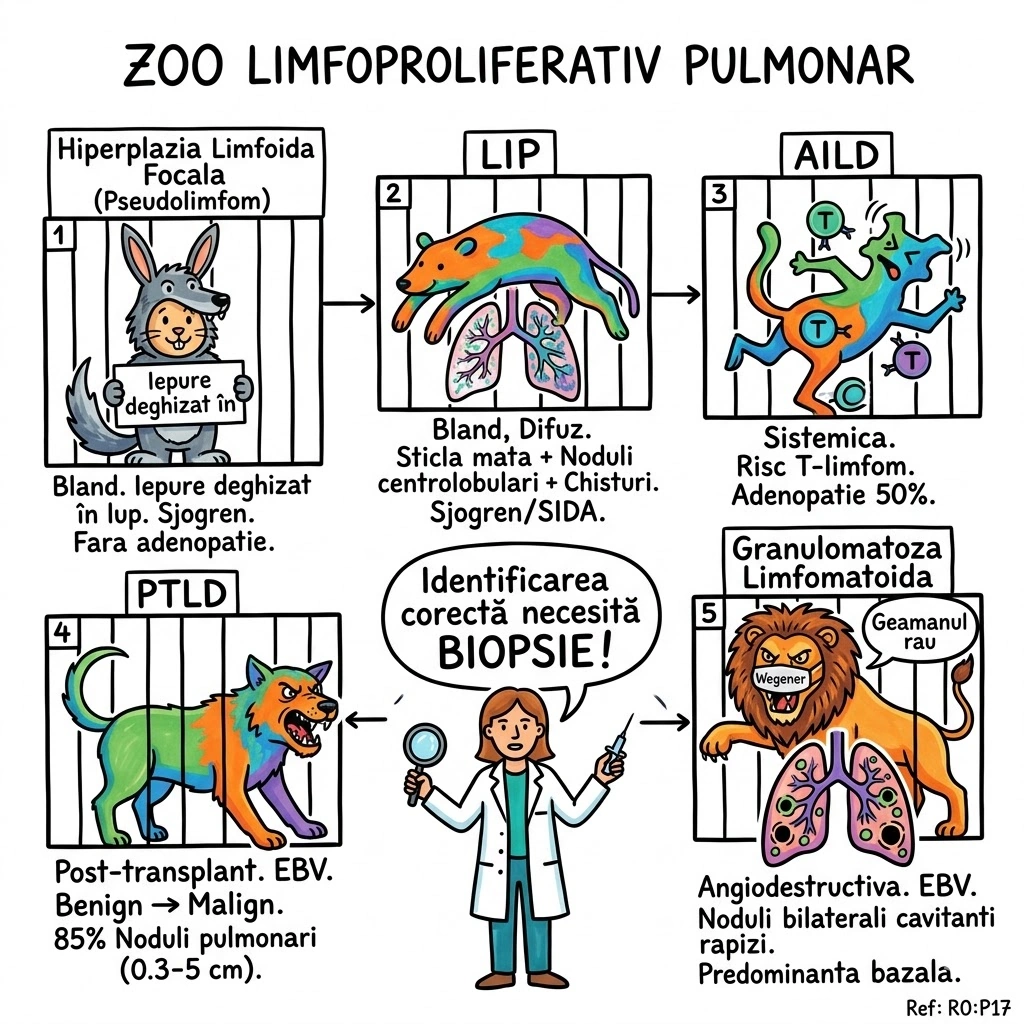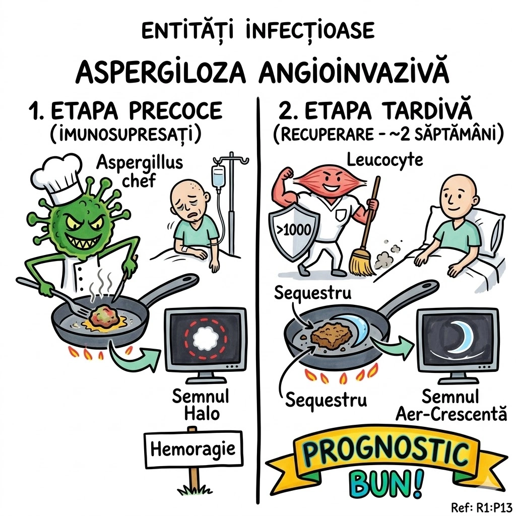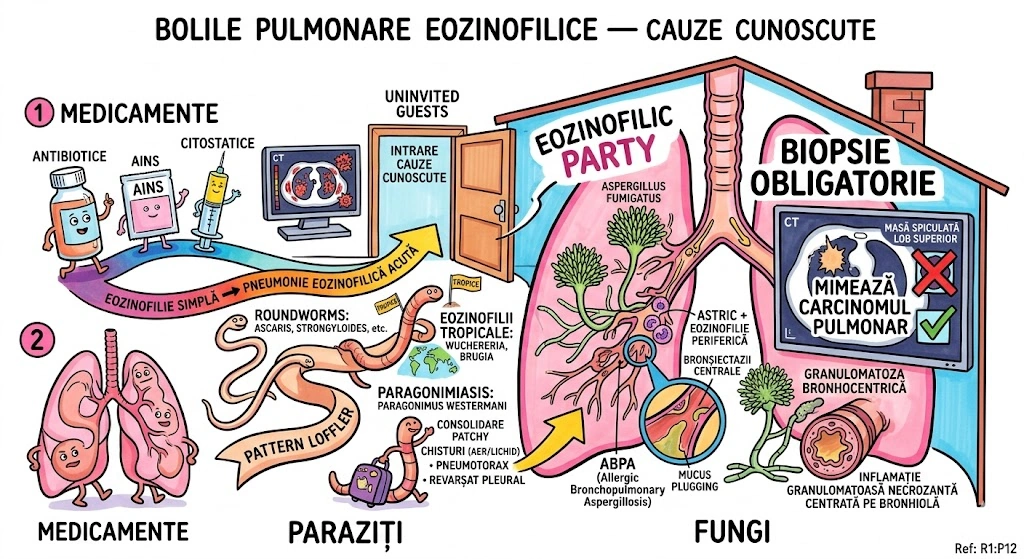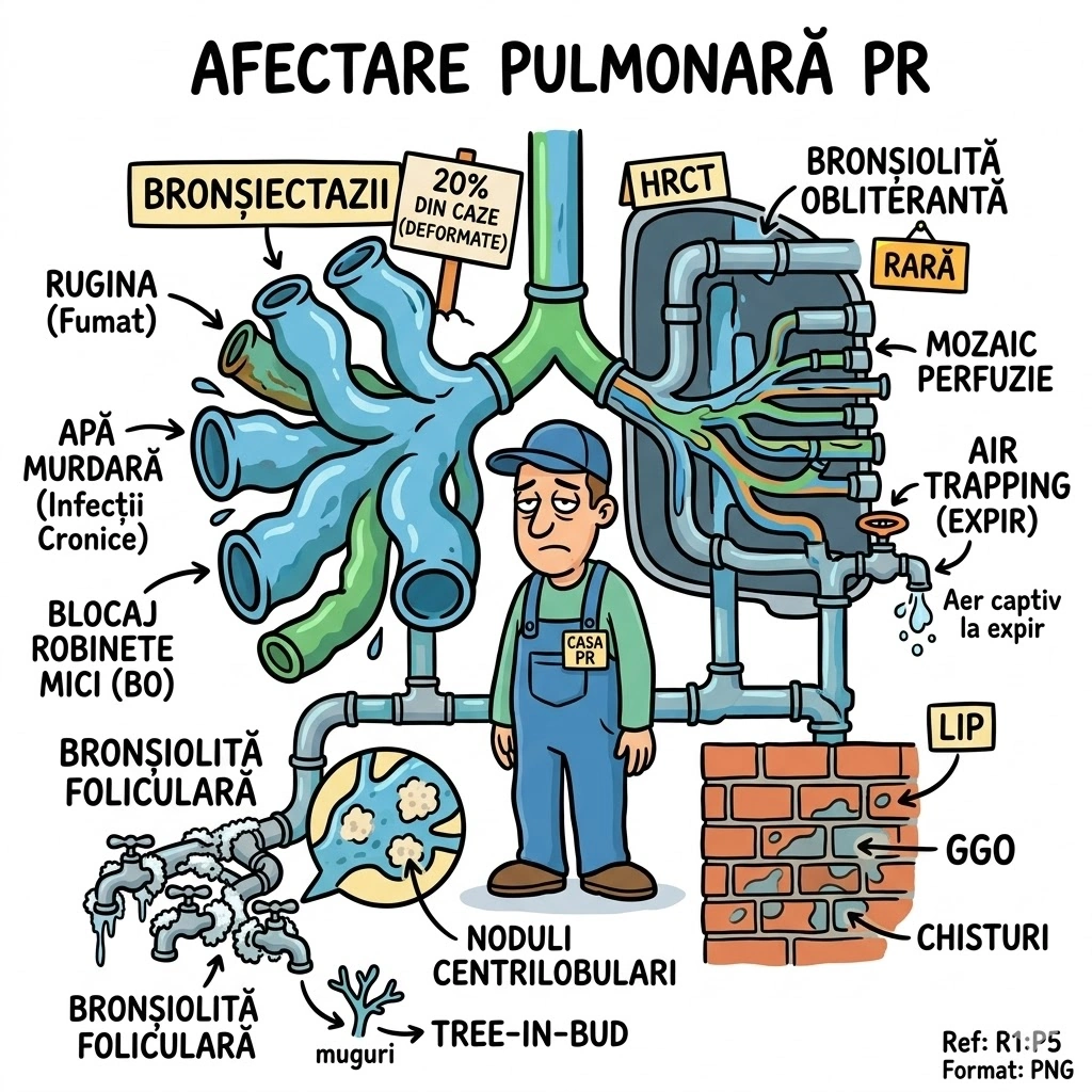 🥊 Ringul Comparatiilor: Consolidarea rapid aparuta (ore) vs. persistent cronica (4–6 saptamani) e diferenta intre un accident de masina si o rugina progresiva. Accidentul (edem, aspiratie, hemoragie) e brusc, dramatic, vizibil imediat. Rugina (eozinofilica, BOOP, carcinom) e lenta, insidioasa, descoperita intamplator. Ambele distrug masina, dar cronometrul iti spune cine e vinovatul.