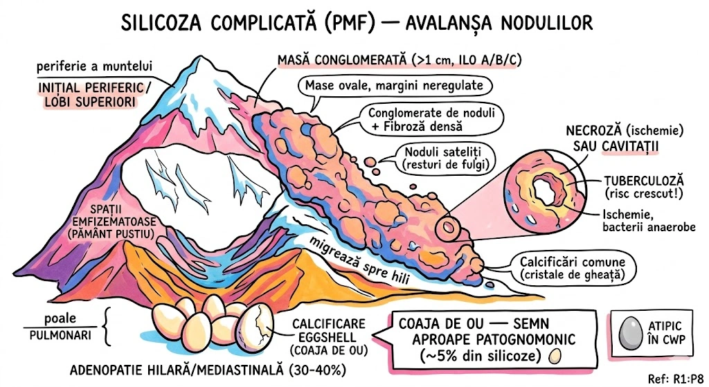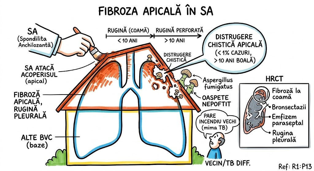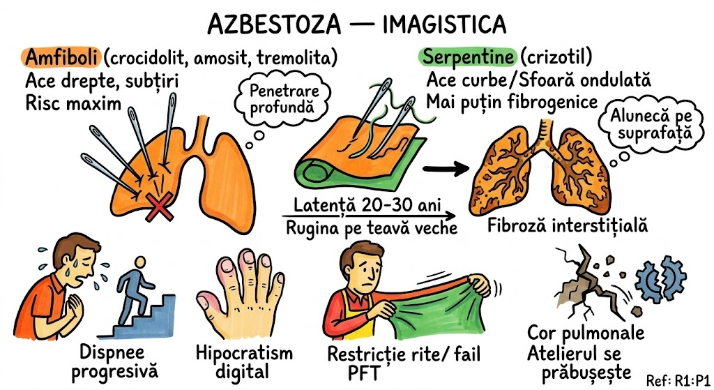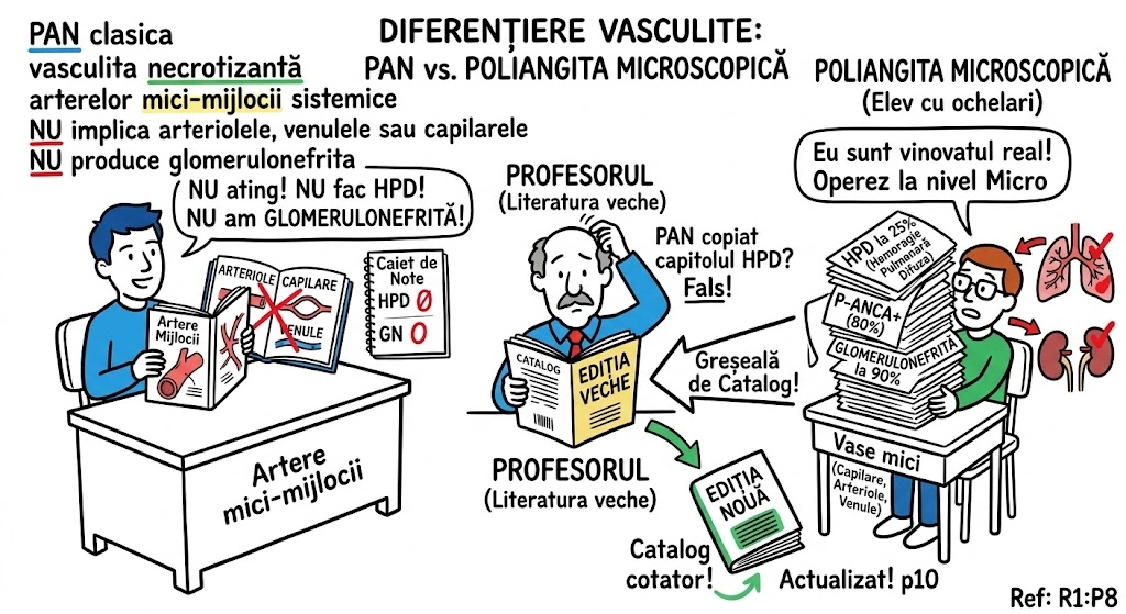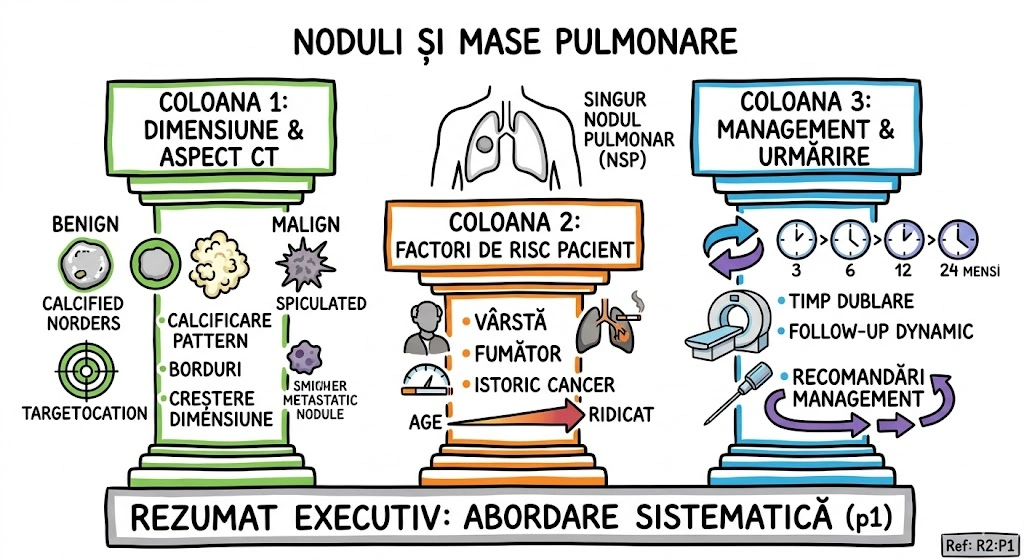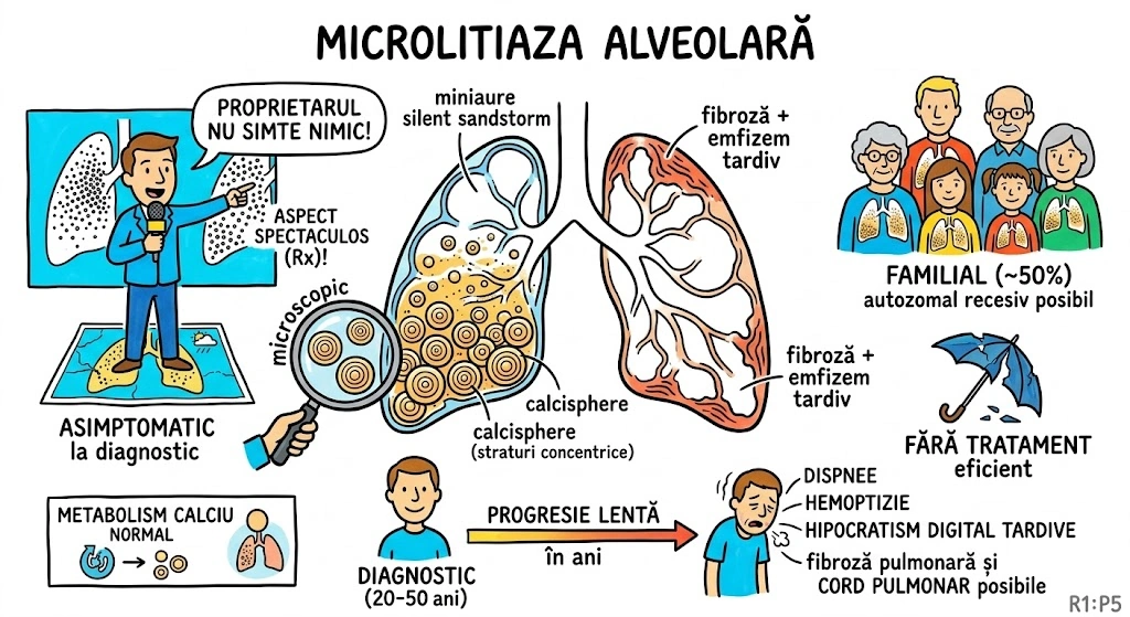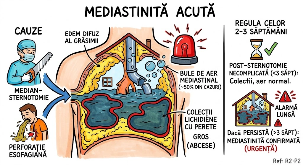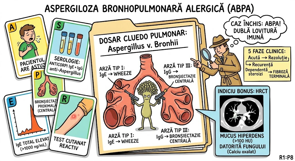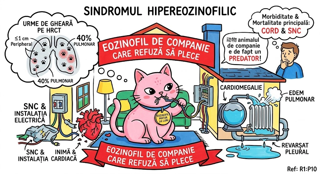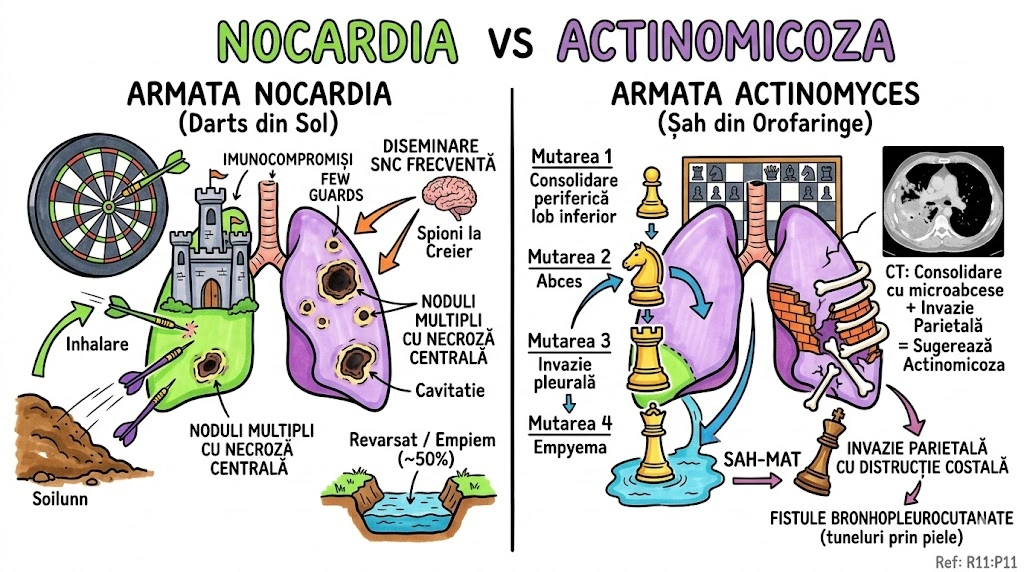 🥊 Ringul Comparatiilor: Consolidarea rapid aparuta (ore) vs. persistent cronica (4–6 saptamani) e diferenta intre un accident de masina si o rugina progresiva. Accidentul (edem, aspiratie, hemoragie) e brusc, dramatic, vizibil imediat. Rugina (eozinofilica, BOOP, carcinom) e lenta, insidioasa, descoperita intamplator. Ambele distrug masina, dar cronometrul iti spune cine e vinovatul.