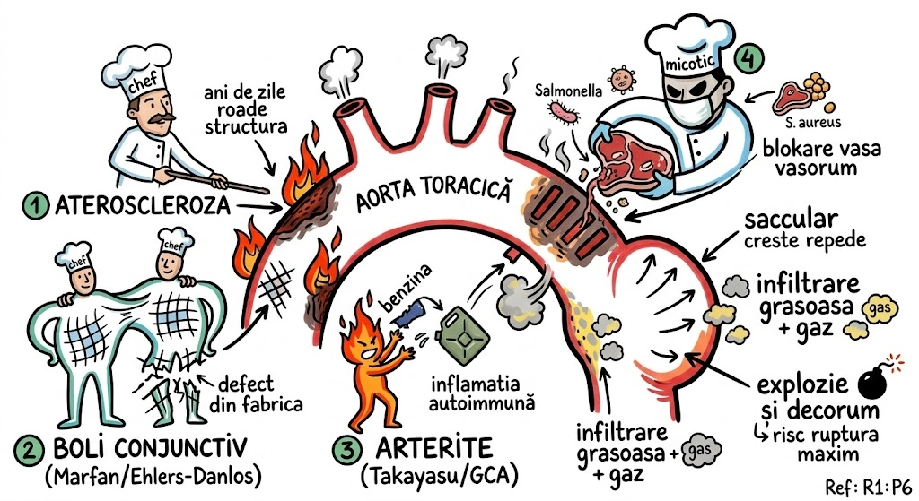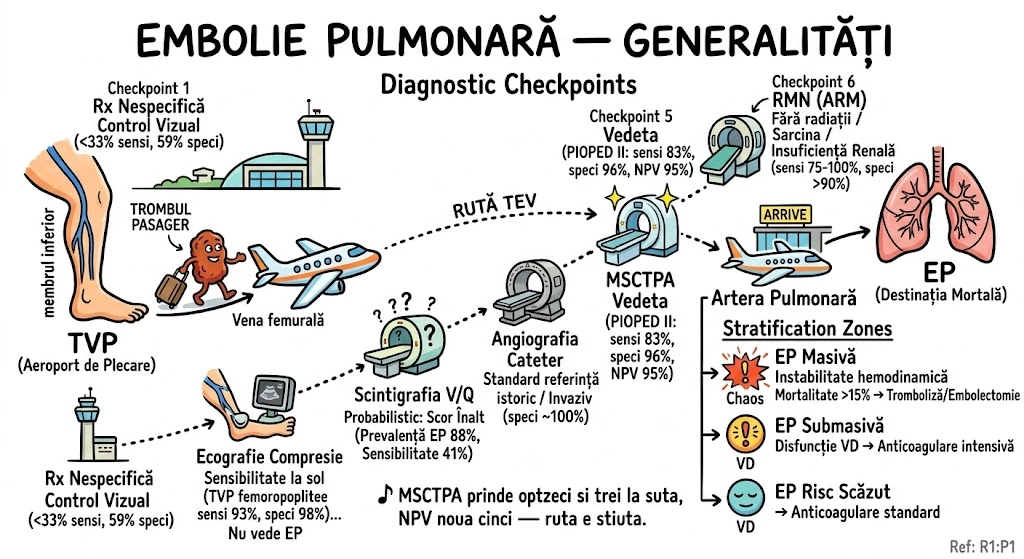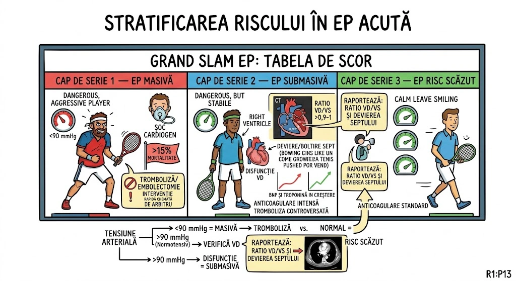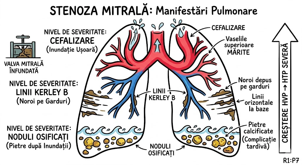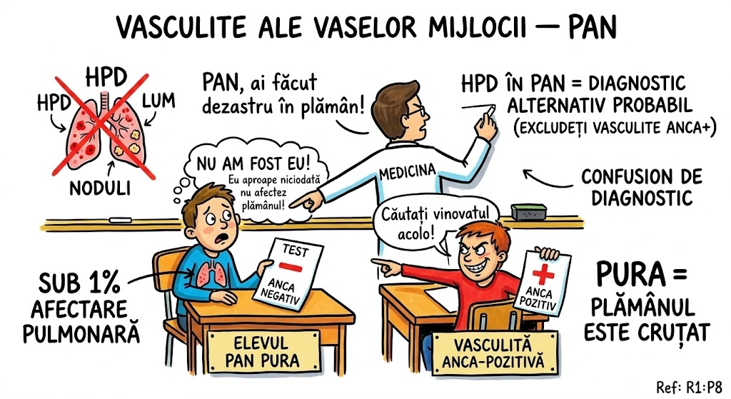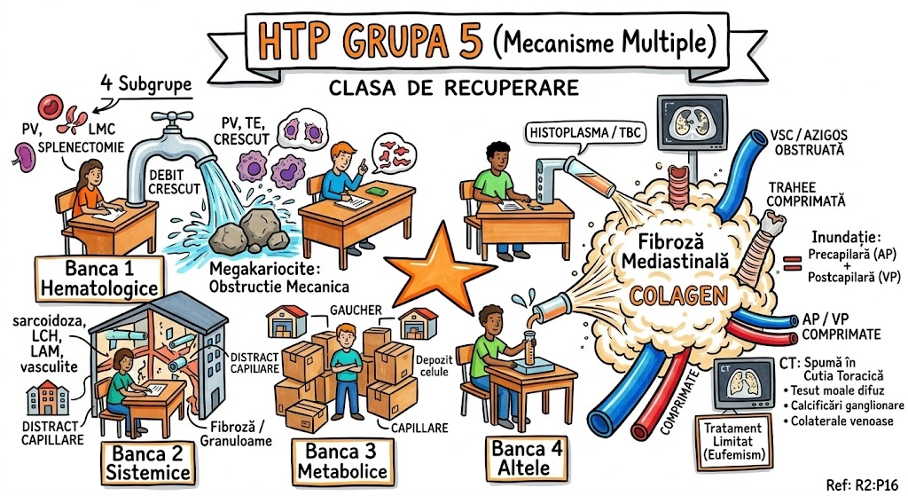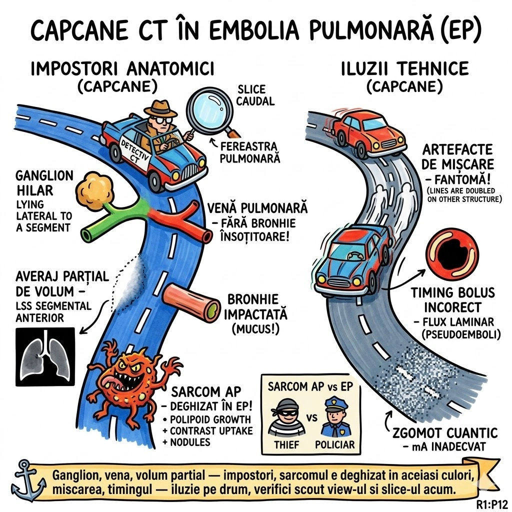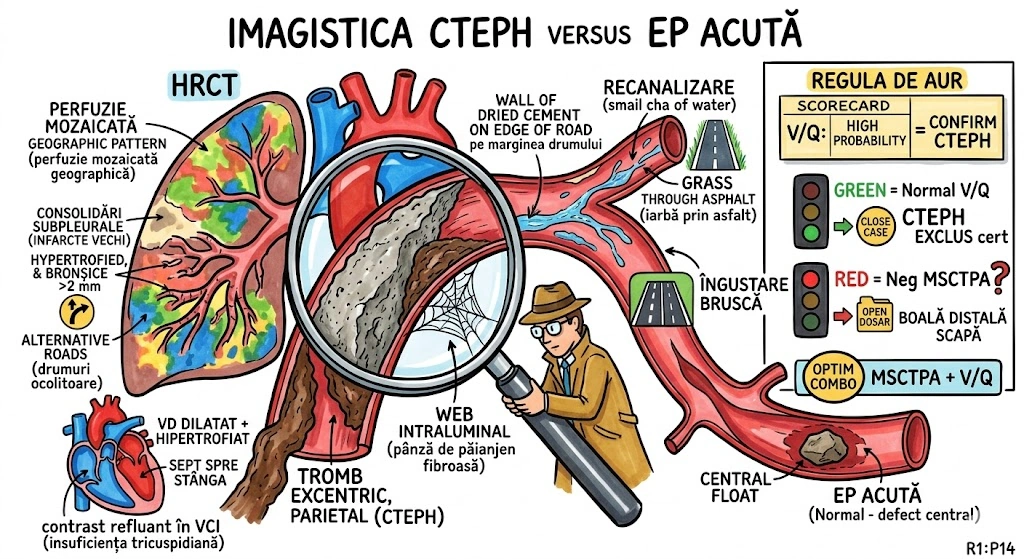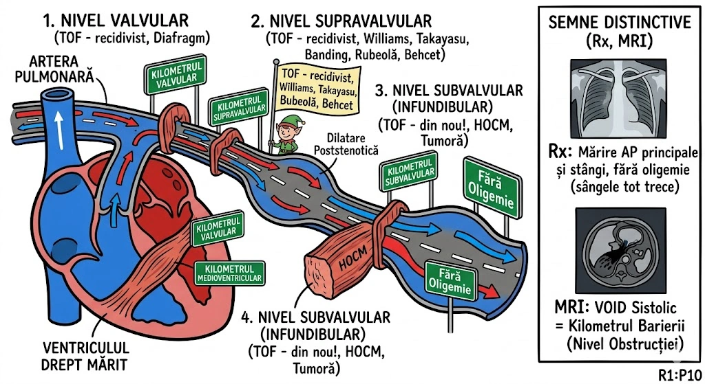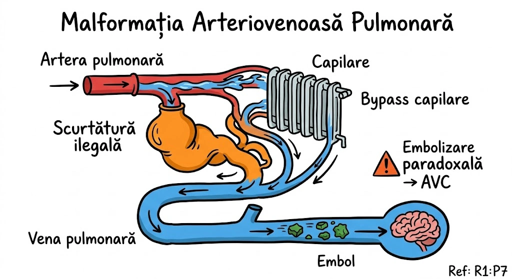 🥊 Ringul Comparatiilor: MAV pulmonara e ca o scurtatura de instalatie facuta in graba — apa ocoleste caloriverele si ajunge direct la canalizare. Diferenta fata de sechestrul bronhopulmonar (p12): sechestrul primeste apa de la alta sursa (artera sistemica din aorta), MAV primeste apa din conducta corecta (artera pulmonara) dar o trimite direct la iesire fara sa treaca prin calorifer (capilare). Ambele sunt defecte vasculare, dar cu circuite complet diferite.
