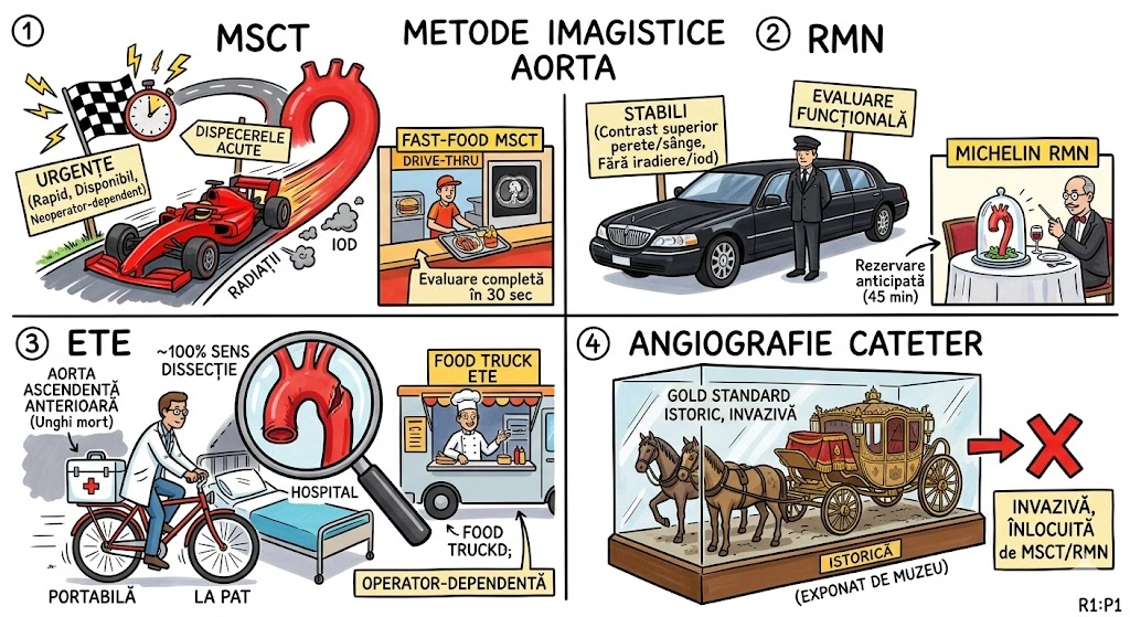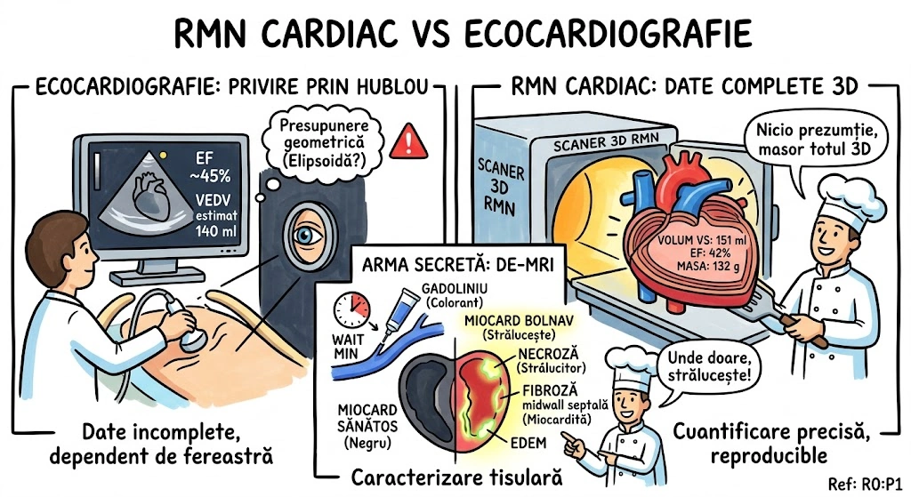 RMN vs. cateterism in era moderna a CHD e ca diferenta dintre a face cumparaturi online (RMN — vezi totul de acasa, fara deplasare, fara riscuri) vs. a merge fizic in magazin (cateterism — util doar cand trebuie sa atingi sau sa repari ceva). Cumparaturile online nu au inlocuit magazinul — l-au rezervat pentru situatiile in care chiar trebuie sa fii acolo (interventii). Diagnosticul se face de acasa.