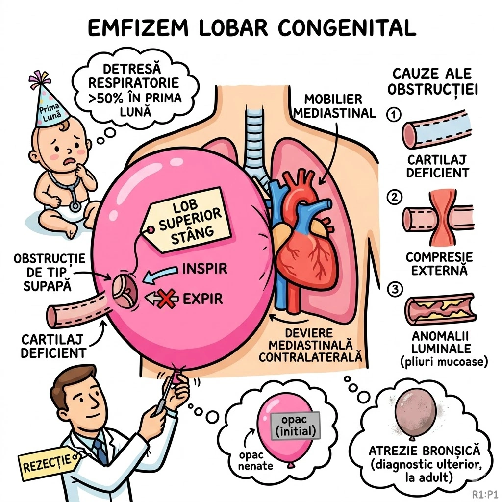 Petrecerea Neonatala din Sala de Nasteri: pe peretele stang al toracelui atarna un balon gigantic — lobul superior stang, umflat pana aproape de explozie. Aerul intra pe un furtun cu supapa defecta (cartilaj absent) dar nu mai iese. Balonul creste si impinge tot mobilierul mediastinal pe cealalta parte (deviere contralaterala). Neonatologul se uita ingrijorat: "Detresa respiratorie in prima luna — asta e emfizem lobar congenital." Detaliu neasteptat: la neonati, balonul poate parea opac initial (lichid pulmonar fetal retentionat) — nu transparent cum te-ai astepta. Solutia: spargi balonul (rezectie). Balonul nespart la nastere devine, cu anii, "atrezie bronsica" — acelasi defect, alt nume, alta varsta.
