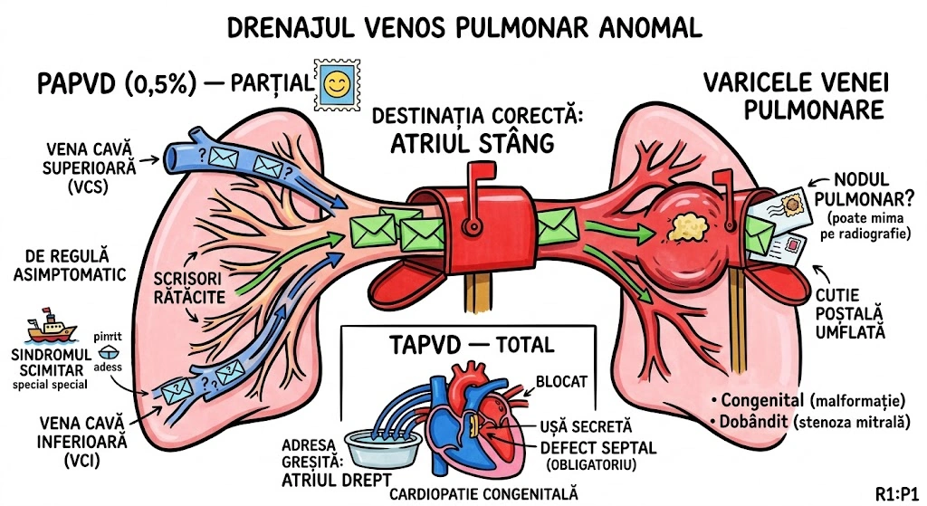 Oficiul postal al sangvenei pulmonare — scrisorile (sangele oxigenat) ar trebui sa ajunga toate la aceeasi adresa (atriul stang). Varicele: o cutie postala umflata (vena dilatata) langa poarta principala (jonctiunea cu atriul stang) — congenitala (defect de constructie) sau dobandita (prea mult trafic postal — stenoza mitrala). Pe radiografie poate arata ca un colet suspect (nodul pulmonar). PAPVD: 0,5% din populatie are scrisorile livrate la adrese gresite — unele ajung la VCS, altele la vena azigos, la VCI sau direct la atriul drept. De regula nimeni nu se plange — descoperire asimptomatica. TAPVD: TOATE scrisorile ajung la adresa gresita — dar pentru ca posta sa functioneze, trebuie sa existe o usa secreta intre cele doua birouri postale (defect septal) — altfel, nimic nu mai ajunge unde trebuie.
