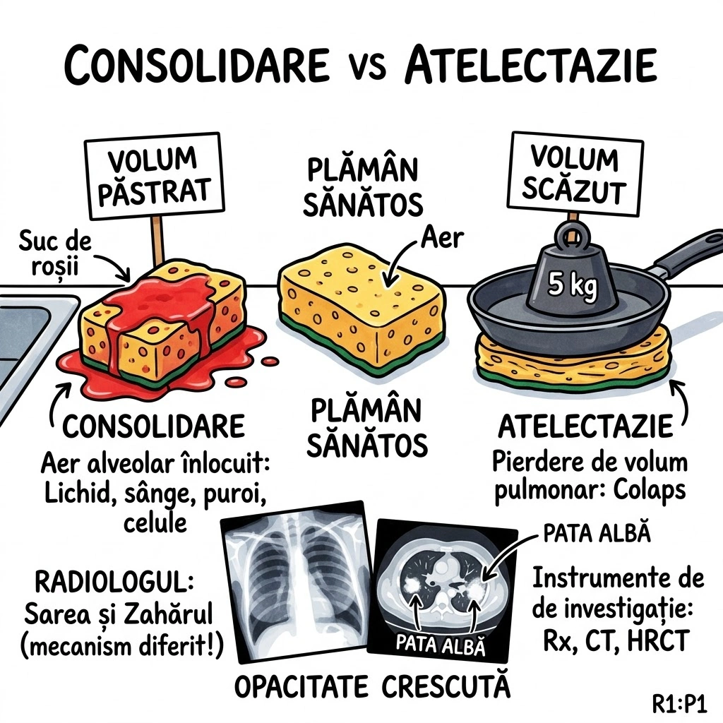 Bucataria radiologiei pulmonare. Pe blat ai doua burete. Buretelui din stanga i-a turnat cineva o cana de suc de rosii — e rosu, plin, greu, dar are aceeasi forma ca inainte. Asta e consolidarea: plin de altceva decat aer. Buretelui din dreapta i-a pus cineva o tigaie de 5 kg deasupra — s-a turtit, s-a comprimat, a pierdut aer si volum. Asta e atelectazia. Ambele burete arata diferit de un burete normal uscat (plamanul sanatos). Ambele sunt vizibile pe radiografie ca zone de opacitate crescuta. Dar radiologul care le confunda e ca bucatarul care confunda sarea cu zaharul — rezultatul final e dezastruos.