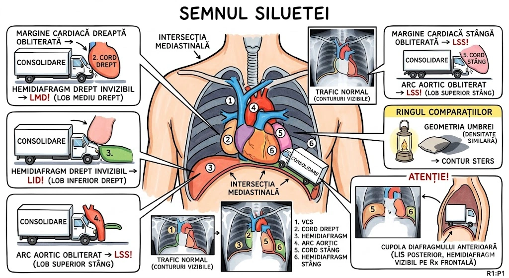 Semnul siluetei: cand plamanul consolidat (sau o masa de tesut moale) contacteaza un organ mediastinal, conturul organului devine invizibil sau slab delimitat. Utilitate: diagnostic de anomalie pulmonara si localizare in lob specific. Pe radiografia frontala (PA/AP): mediastin superior drept (VCS) obliterat → LSD; marginea dreapta a cordului obliterata → LMD (frecvent) sau LID medial (mai rar); hemidiafragm drept invizibil → LID; mediastin superior stang (arcul aortic) obliterat → LSS; marginea stanga a cordului obliterata → segmentele lingulare (LSS); hemidiafragm stang/aorta descendenta obliterate → LIS. Pe radiografia laterala: marginea posterioara a cordului/hemidiafragm posterior stang → LIS; hemidiafragm drept anterior → LMD; hemidiafragm drept posterior → LID. Atentionari: semnul siluetei nu functioneaza intotdeauna; pierderea de volum (atelectazie) poate modifica relatiile anatomice; cupola diafragmului este relativ anterioara — consolidarea lobilor inferiori poate fi posterior fata de ea, hemidiafragmul ramanand vizibil pe frontala.