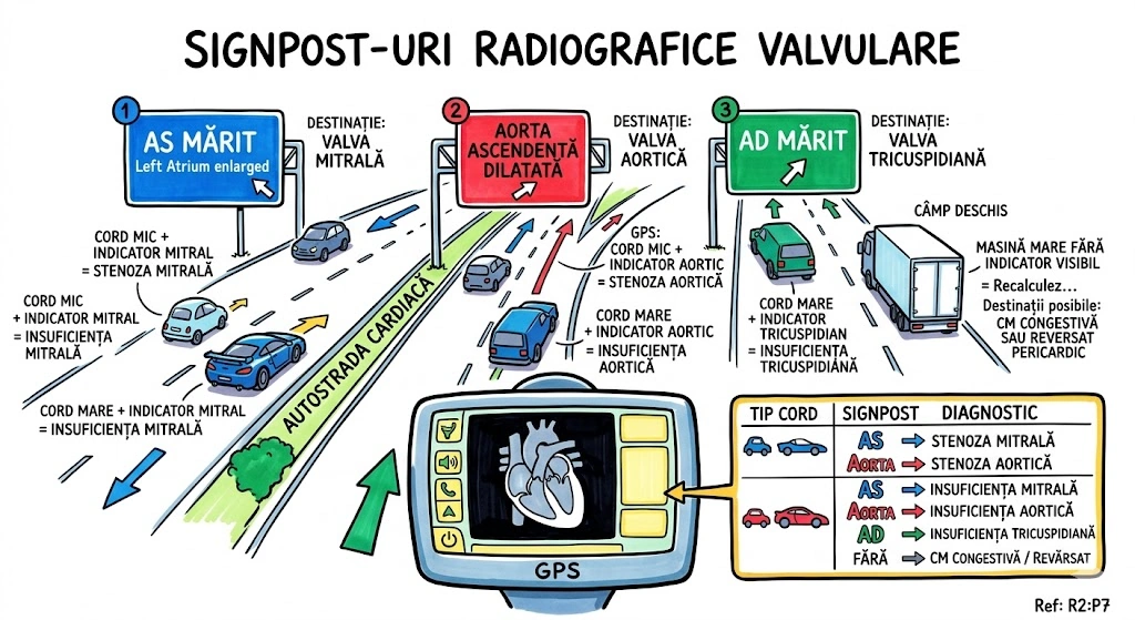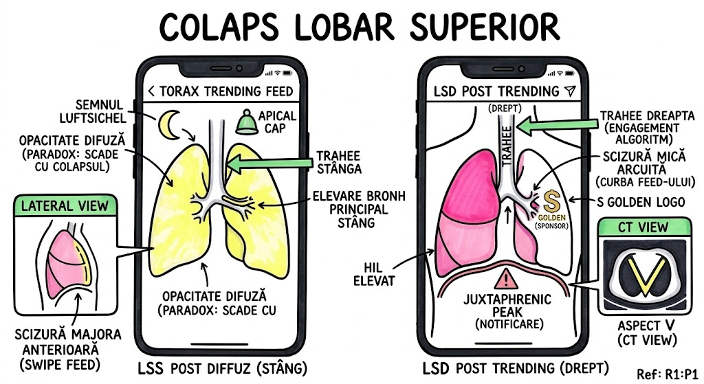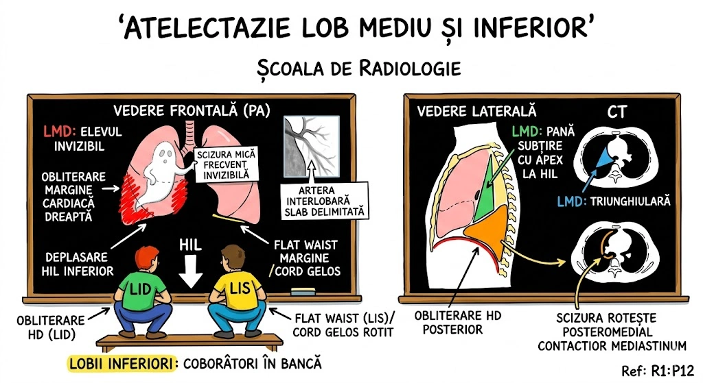 Intersectia Mediastinala, ora de varf. Sase vehicule parcate in linie: VCS, Cord Drept, Hemidiafragm Drept, Arc Aortic, Cord Stang, Hemidiafragm Stang. Un camion alb (consolidarea) vine si se lipeste bumper-to-bumper de Cordul Drept. Marginea cardiaca dreapta dispare complet pe radiografie. „LMD!" Acelasi camion, alta zi, se lipeste de hemidiafragmul drept. Cupola dispare. „LID!" Regulile sunt fixe ca sensurile unice — fiecare vehicul contactat iti spune exact din ce lob vine camionul. Atentie: cupola diafragmului e relativ anterioara — consolidarea lobilor inferiori poate fi posterioara, iar hemidiafragmul poate ramane vizibil pe frontala. Semnul siluetei nu functioneaza intotdeauna — se coreleaza cu alte semne.