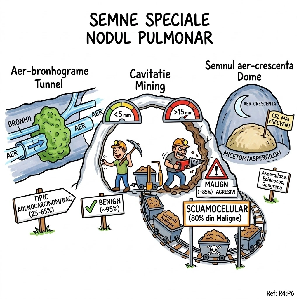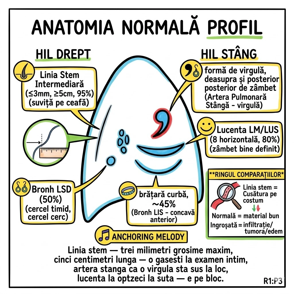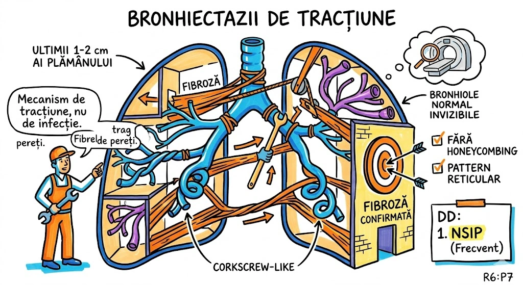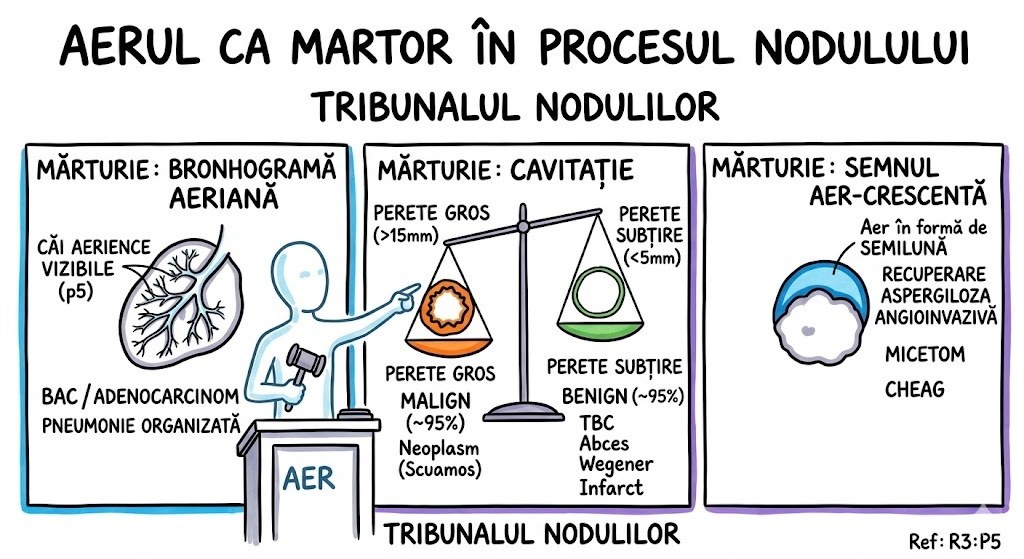 🥊 Ringul Comparatiilor: Bronhograma aeriana prezenta vs. absenta e diferenta intre un pod deschis peste o apa tulbure si un pod inundat sub apa — in ambele cazuri apa e problema, dar traficul pe pod e diferit. Prezenta: bronhiile sunt permeabile, aerul trece, dar parenchimul e plin de altceva. Absenta: bronhia insasi e blocata (tumora, mucus) sau umpluta de procesul patologic (infarct cu bronhii pline de sange).