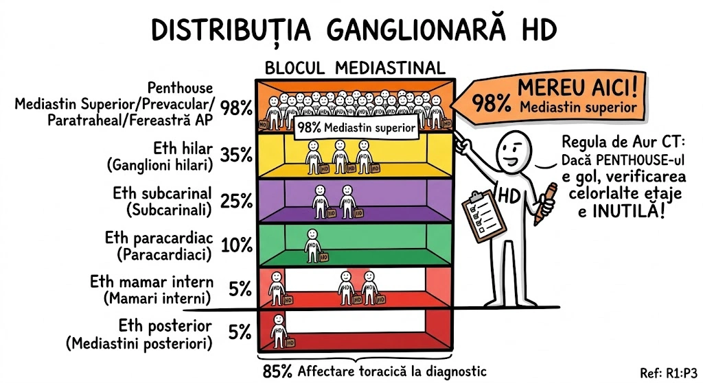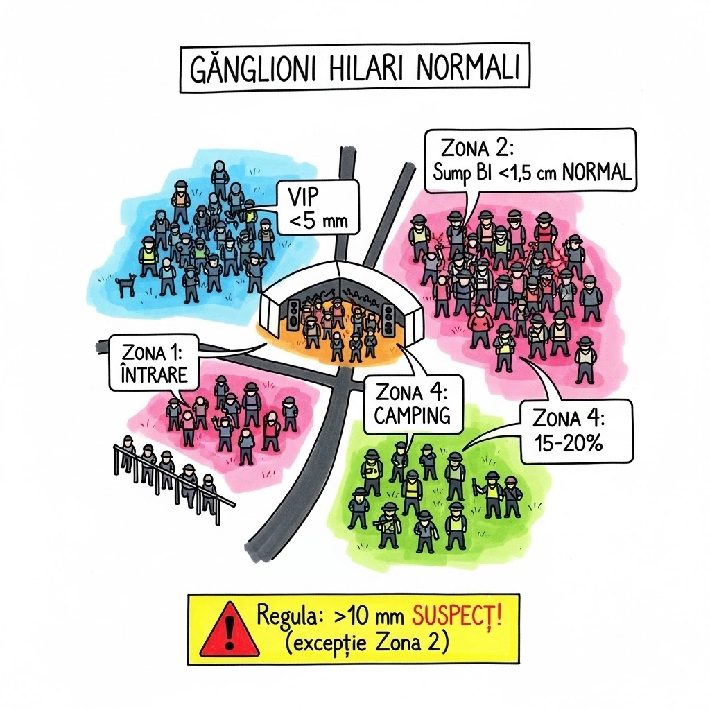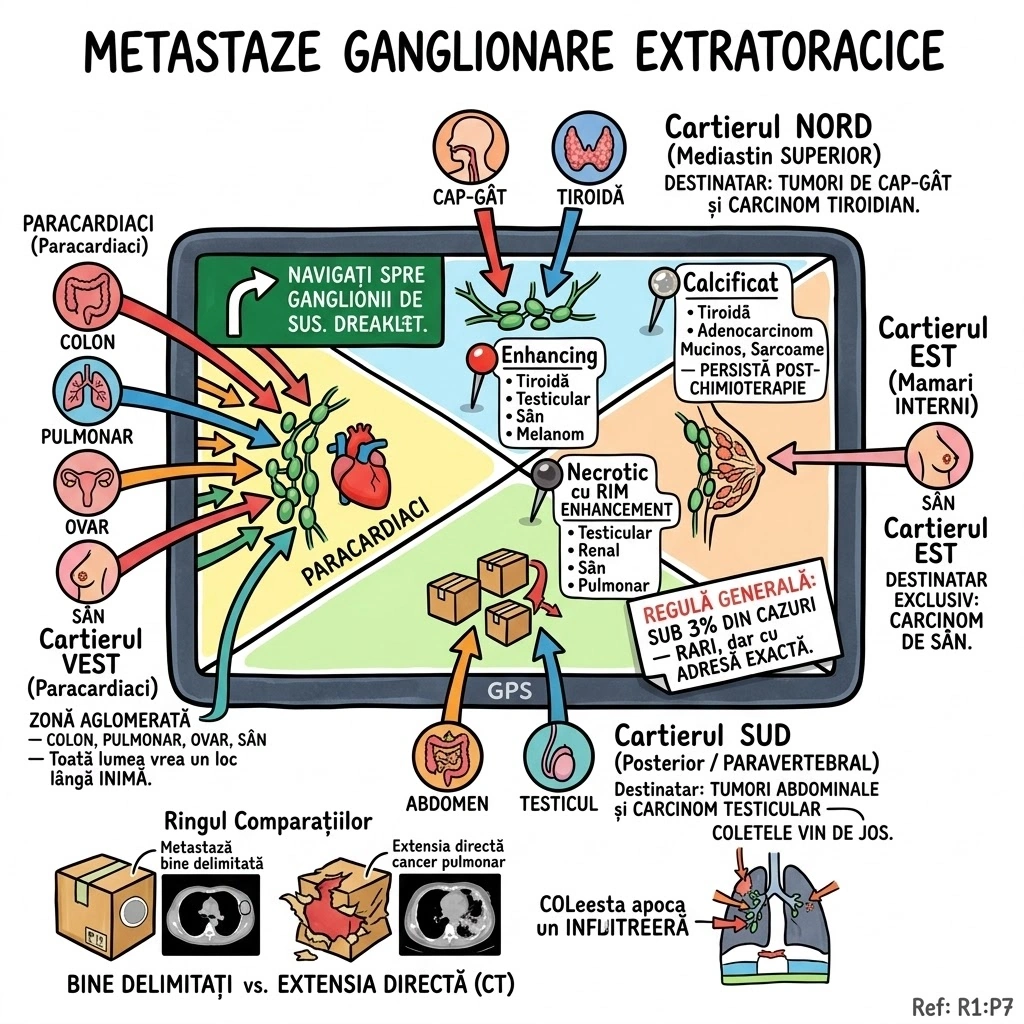 Inima ca un apartament cu patru zone distincte, si fiecare tumora e un chirias cu preferinta clara pentru o anumita camera. Zona 1 — Livingul (Intracavitar): spatiul din interiorul camerelor cardiace, acolo unde stau mixoamele, trombii si alte mase care plutesc in sange. Zona 2 — Peretii (Intramural): grosimea peretilor miocardici, unde se ascund rabdomioamele si fibroamele — nu le vezi de pe coridor, trebuie sa spargi tencuiala. Zona 3 — Acoperisul (Intrapericardic): pe conturul extern al pericardului — feocromocitoamele stau ca antenele de satelit puse pe acoperis fara autorizatie. Zona 4 — Gradina (Paracardiac/Mediastinal): extracardiac dar adiacent — tumori mediastinale care se invecineaza cu inima. In acest apartament, 80% din chiriasii permanenti (tumorile primare) sunt pasnici (benigni). Dar vizitatorii temporari (tumorile secundare) sunt de 40 de ori mai numerosi.
