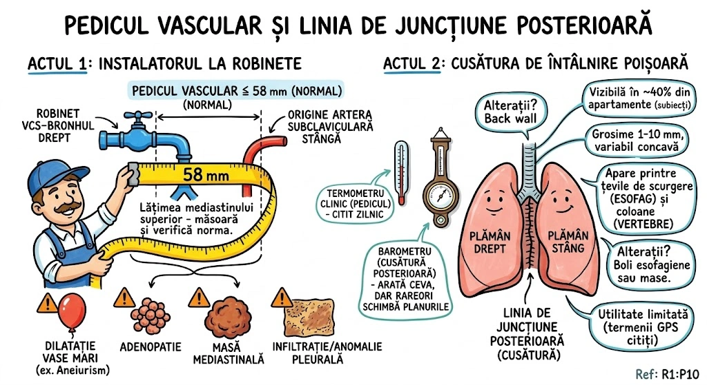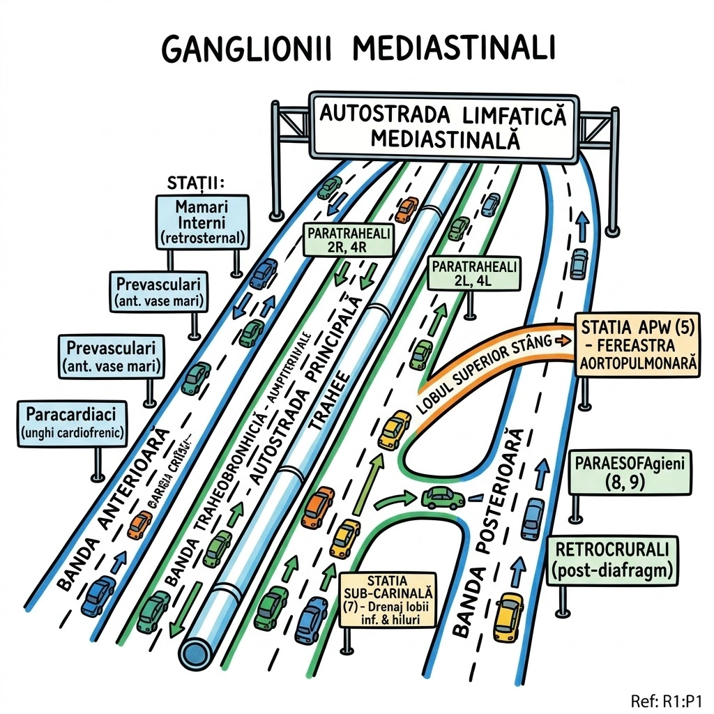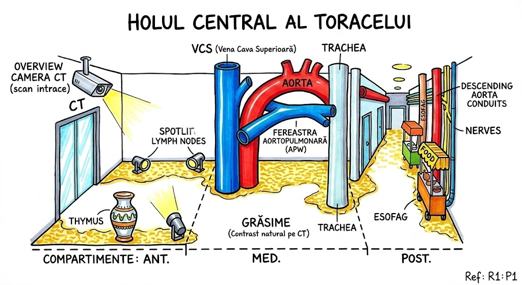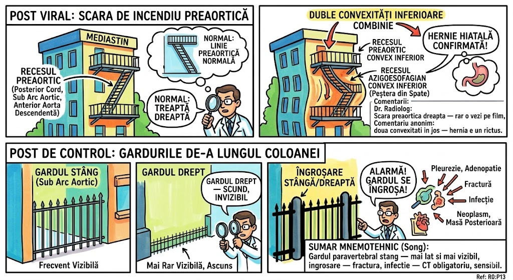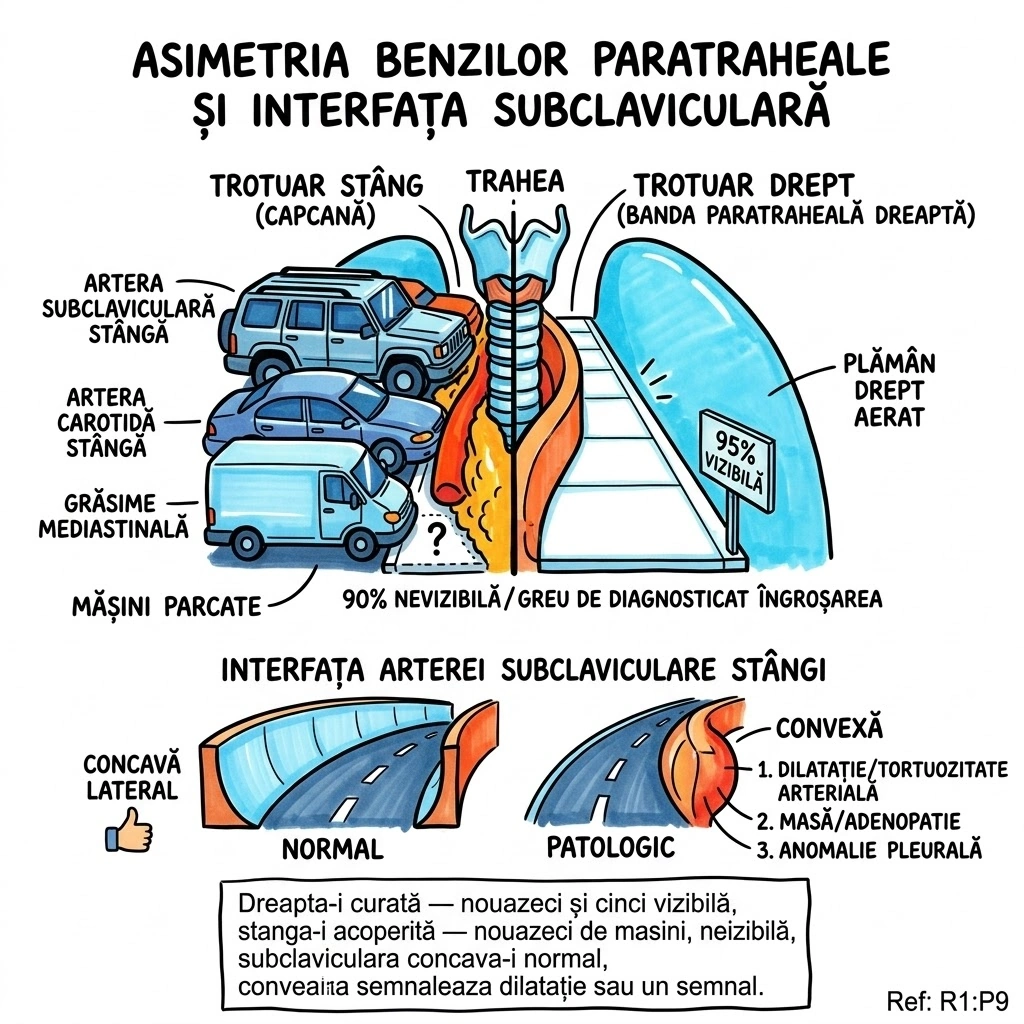Traficul in intersectia mediastinala. Fiecare vehicul parcat (organ mediastinal) isi pierde conturul cand un alt vehicul (consolidare) se lipeste de el bumper-to-bumper. In intersectia toracica din fata (PA): vehiculul VCS (mediastin superior drept) — cand LSD se lipeste, conturul superior drept dispare. Vehiculul Cord Drept — cand LMD se lipeste, marginea cardiaca dreapta dispare. Vehiculul Hemidiafragm Drept — cand LID se lipeste, cupola dreapta devine invizibila. Vehiculul Arc Aortic — cand LSS se lipeste, mediastinul superior stang dispare. Vehiculul Cord Stang — cand segmentele lingulare se lipesc, marginea cardiaca stanga dispare. Vehiculul Hemidiafragm Stang — cand LIS se lipeste, cupola stanga dispare.