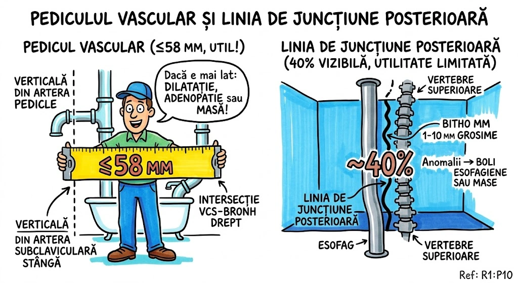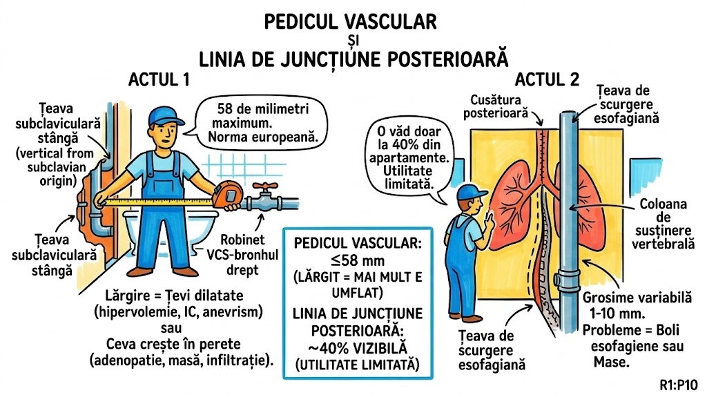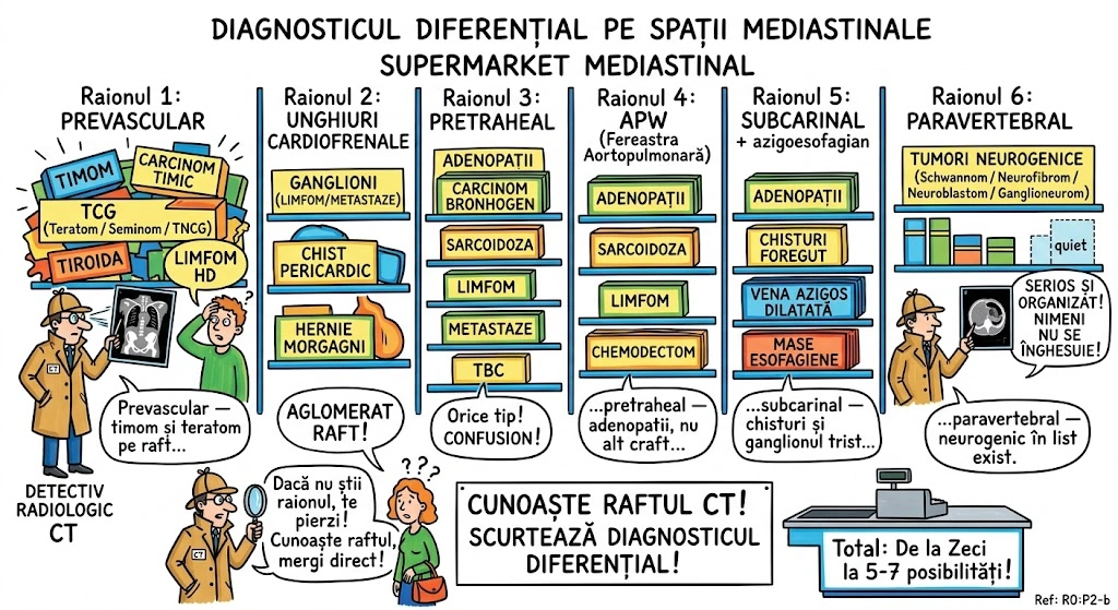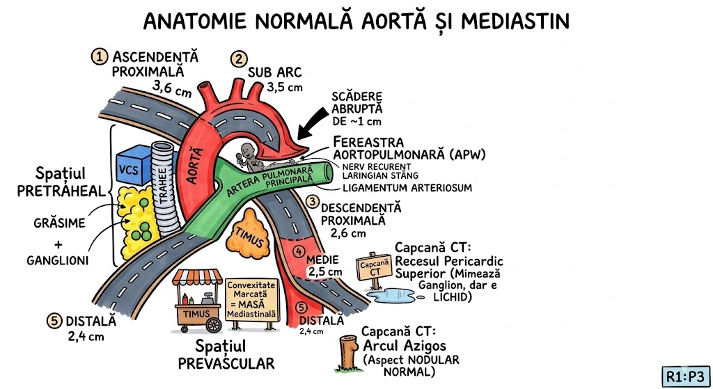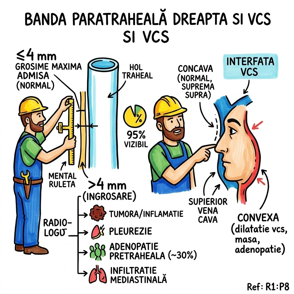 Traficul in intersectia mediastinala. Fiecare vehicul parcat (organ mediastinal) isi pierde conturul cand un alt vehicul (consolidare) se lipeste de el bumper-to-bumper. In intersectia toracica din fata (PA): vehiculul VCS (mediastin superior drept) — cand LSD se lipeste, conturul superior drept dispare. Vehiculul Cord Drept — cand LMD se lipeste, marginea cardiaca dreapta dispare. Vehiculul Hemidiafragm Drept — cand LID se lipeste, cupola dreapta devine invizibila. Vehiculul Arc Aortic — cand LSS se lipeste, mediastinul superior stang dispare. Vehiculul Cord Stang — cand segmentele lingulare se lipesc, marginea cardiaca stanga dispare. Vehiculul Hemidiafragm Stang — cand LIS se lipeste, cupola stanga dispare.