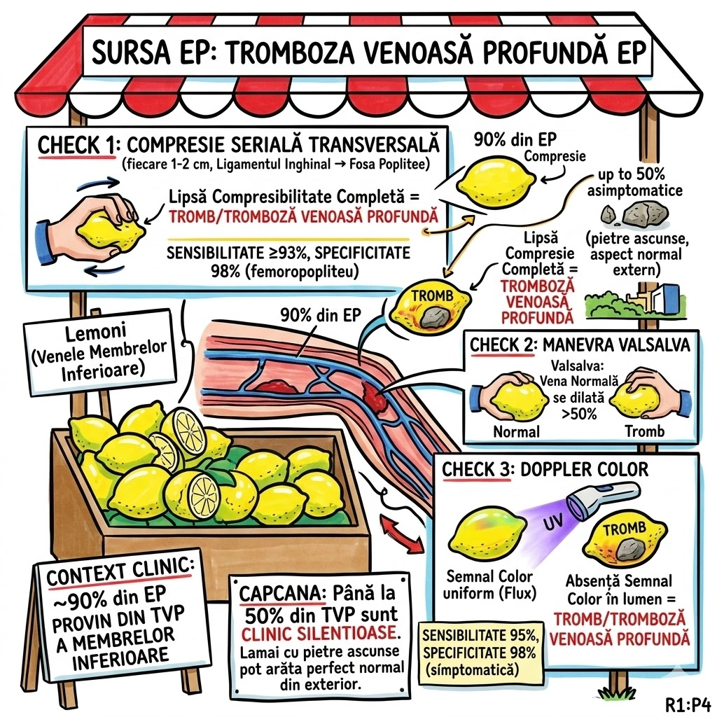 🥊 Ringul Comparatiilor: Trombul recent (T1+T2 inalt) vs. trombul vechi (T1+T2 scazut) functioneaza ca un semafor care se schimba cu timpul: initial e pe verde (semnal inalt — proaspat, activ, periculos embolic), apoi trece pe galben (intermediar), apoi pe rosu (semnal scazut — vechi, organizat, stabil). Acelasi obiect, semnal complet diferit in functie de timp. Timpul schimba diagnosticul imagistic fara sa schimbe diagnosticul clinic — ramane tromb.