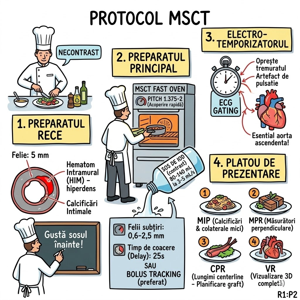 Bucataria RMN are 7 ustensile aranjate pe blat. Bucatarul-rezident le priveste, confuz: "De ce nu pot folosi unul singur?" Seful de bucatarie ii raspunde sec: "Pentru ca un cutit nu face acelasi lucru cu un termometru." T1 SE = cutitul. T2 SE = termometrul. T1+Gd = lampa UV. Fat-sat = situla de grasime. Cine = camera video. DE-MRI = fotograful care vine tarziu. Sagitale/coronale = oglinda retrovizoare. Fiecare are un singur job. Niciunul nu il inlocuieste pe altul. Si deasupra blatului, un post-it: "Pe SE sangele curge NEGRU. Pe Cine sangele e ALB. Inverseaza asta si interpretezi tot invers." Asta e genul de informatie care pare banala pana cand confunzi un tromb cu un pool sangvin.