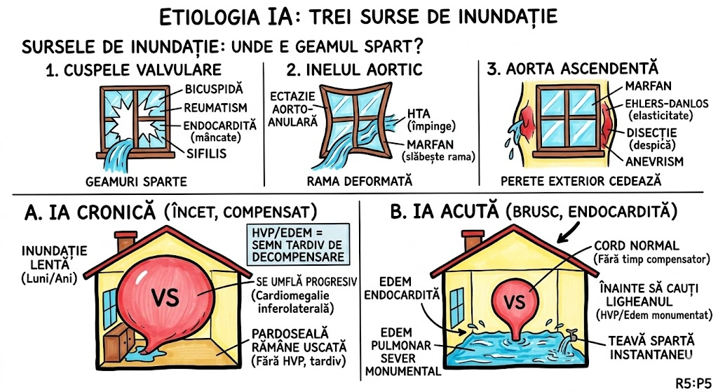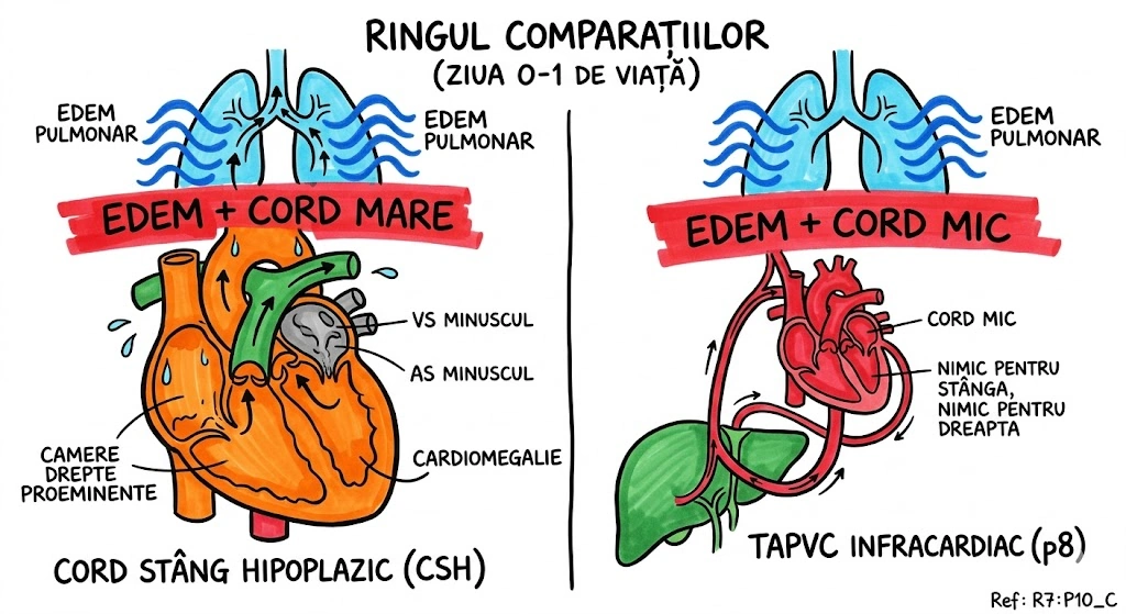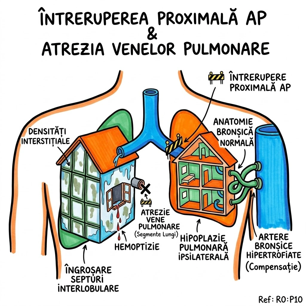 🥊 Ringul Comparatiilor: Intreruperea AP si atrezia venelor pulmonare sunt ca doua case cu defecte complementare: una nu primeste apa (intrare blocata), cealalta nu o poate evacua (iesire blocata). Ambele duc la un plaman suferind, dar prin mecanisme opuse. Hipoplazia pulmonara (p8) le uneste — ambele sunt cauze ale ei. Diferenta fata de sindromul scimitar (p9): in scimitar, apa de iesire merge in alta directie (VCI); aici, apa nu are pe unde sa iasa deloc.