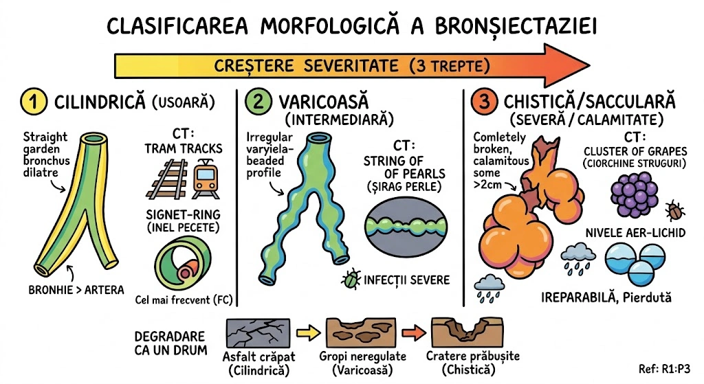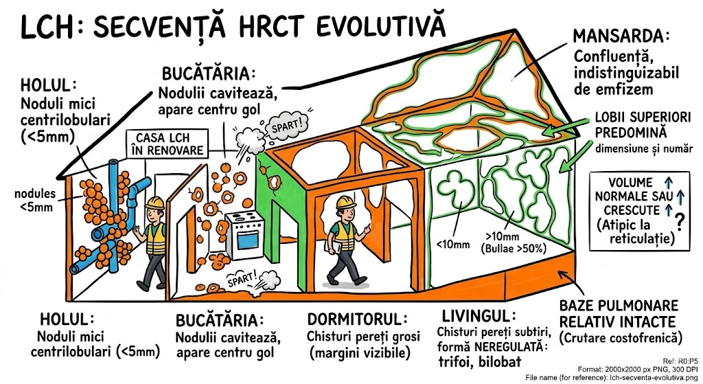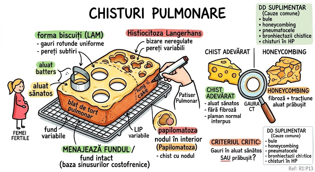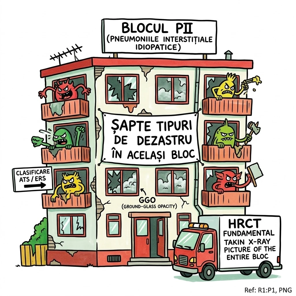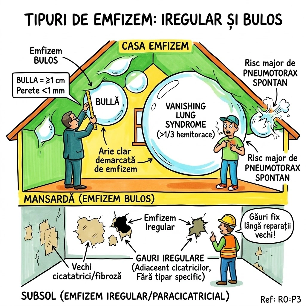 Un bloc de apartamente construit gresit din fabrica, cu cinci tipuri de defecte arhitecturale. Etajul 1 (Tip 1 — 65% din blocuri): apartamente mari, spatioase (chisturi >2 cm), cu geamuri mari (chisturi aerate, vizibile pe CT ca mase multichistice). Locatarii traiesc confortabil — prognostic bun. Etajul 2 (Tip 2 — 20-25%): garsoniere mici si inghesuie (chisturi <2 cm). Locatarii au si alte probleme: rinichi defecti, inima cu defecte — prognostic rezervat. Subsolul (Tip 3 — 10%): spatii microscopice, practic invizibile (<3-5 mm). Pe CT arata ca o masa solida. Prognostic rezervat. Mansarda si terasa (Tipuri 0 si 4): rare, aspecte variabile. Intregul bloc comunica cu sistemul de ventilatie (arborele bronsic) si e alimentat de conducta principala (artera pulmonara). La 70% din blocuri, defectele se vad in prima saptamana de la constructie (nastere). Solutia radicala: demolarea etajului defect (excizie lobara).