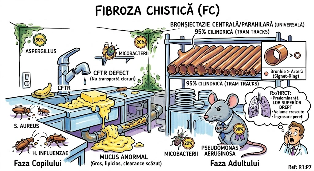 🥊 Ringul Comparatiilor: Chistul bronhogenic pulmonar e ca un borcan de conserve gasit la curatenia de primavara din pivnita — nu stii ce e inauntru pana nu il deschizi (sau pana se infecteaza singur). Diferenta fata de CCAM/CPAM (p6): borcanul e singular si bine delimitat; CCAM e o intreaga debara plina de borcane de marimi diferite, unele microscopice, toate intr-o dezordine congenitala.