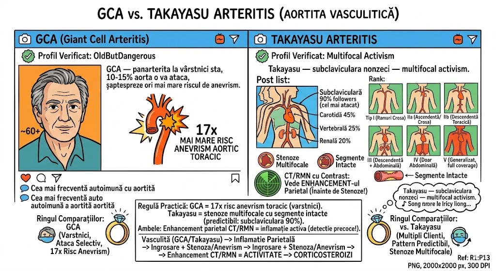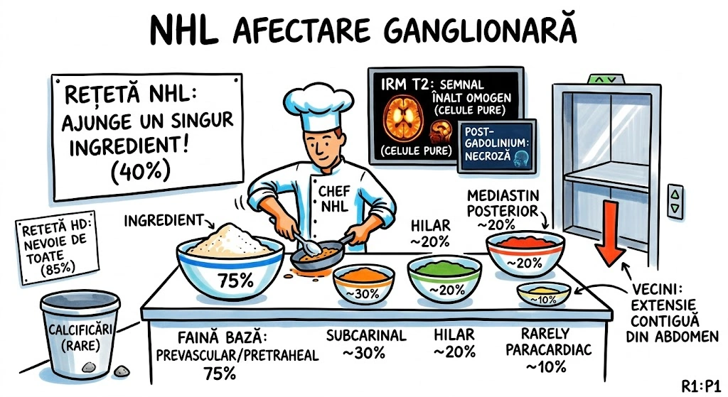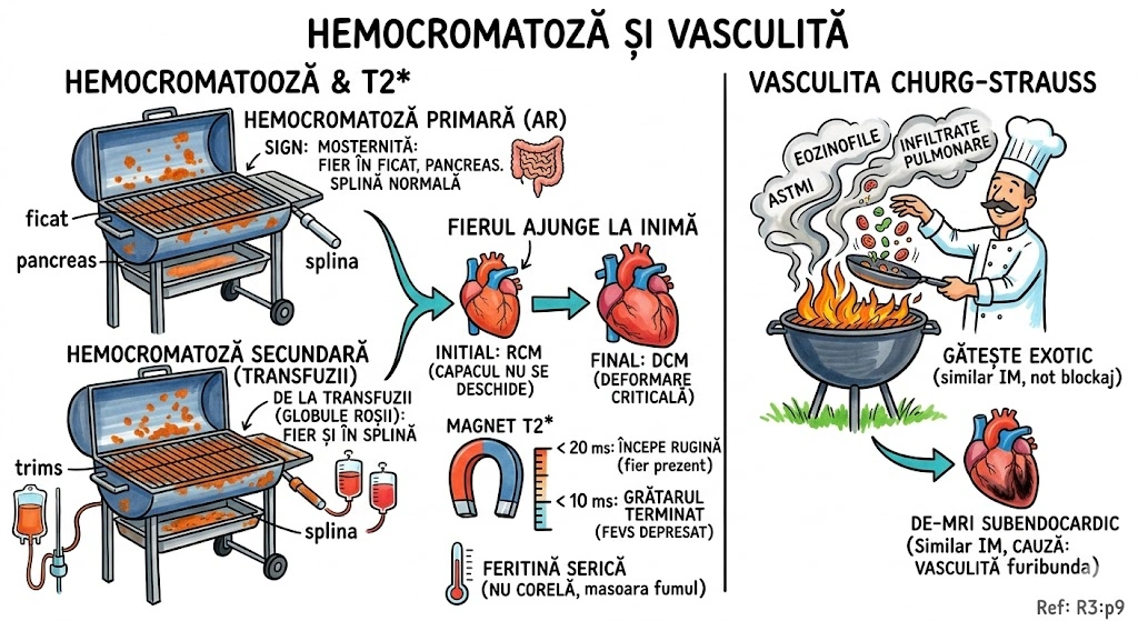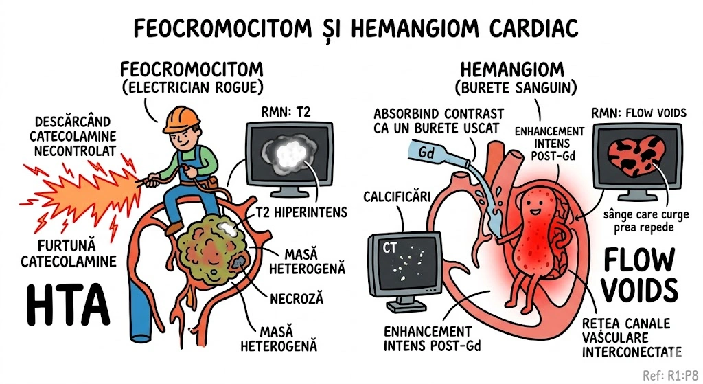 🥊 Ringul Comparatiilor: Feocromocitomul cardiac e ca o instalatie electrica defecta pe acoperisul casei — produce scurtcircuite (HTA prin catecolamine) si trebuie reparata urgent. Hemangiomul e ca un rezervor de apa in pivnita — plin cu canale, calcificari vechi, dar nu produce scurtcircuit electric. Ambele "instalatii" sunt pline de lichid (T2 hiperintens) si ambele absorb contrastul (Gd enhancement intens), dar doar instalatia defecta de pe acoperis face HTA.
