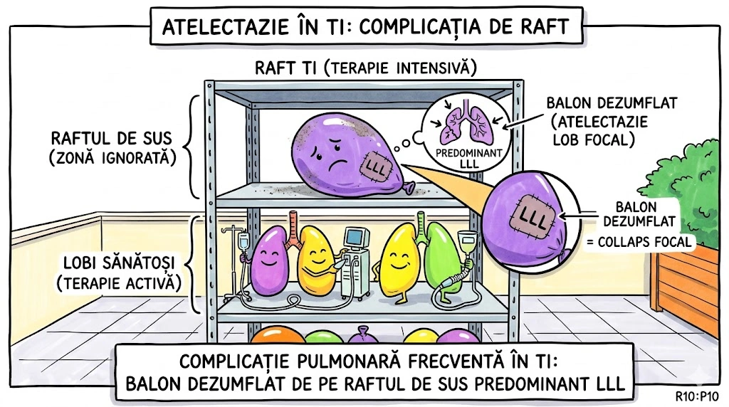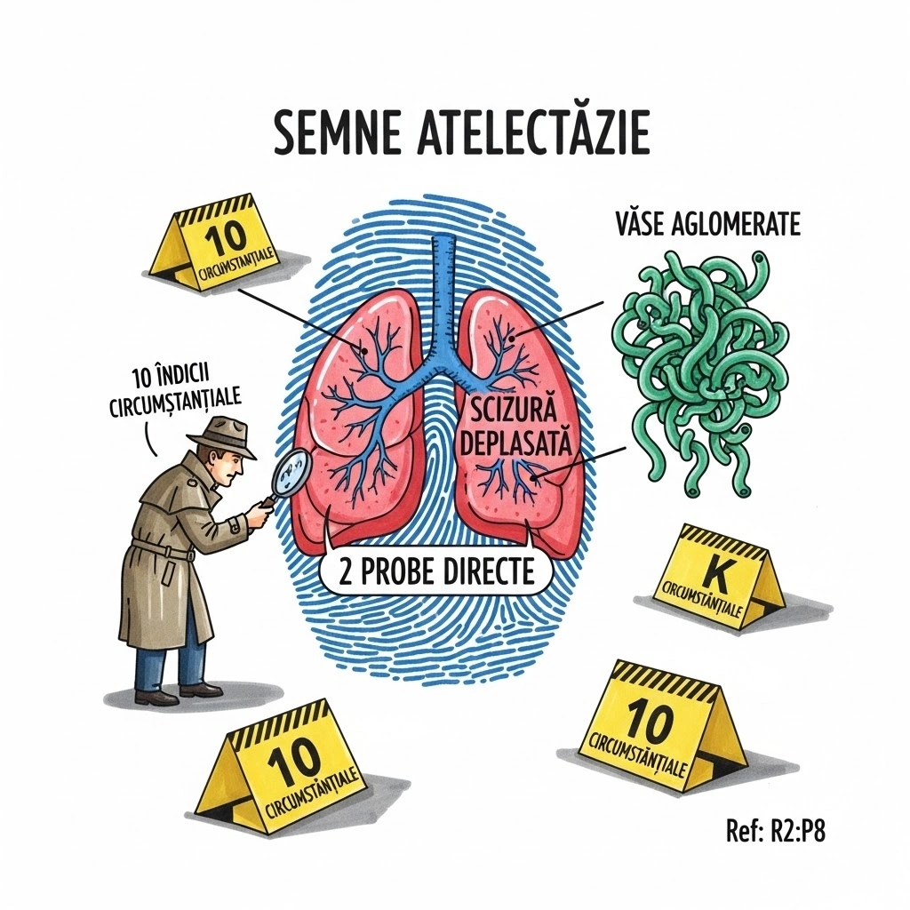 🥊 Ringul Comparatiilor: Consolidarea si atelectazia sunt ca doua moduri diferite de a pierde un apartament. La consolidare, apartamentul (alveola) e ocupat ilegal de chiriasi-problema — apa, sange, puroi, celule. Spatiul exista, dar locatarul original (aerul) a fost dat afara. La atelectazie, apartamentul insusi s-a prabasit — nu mai exista spatiu. Ambele duc la „adresa indisponibila" pe radiografie, dar mecanismul si tratamentul sunt radical diferite.