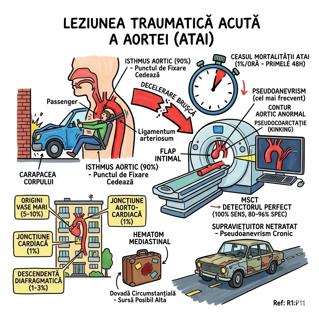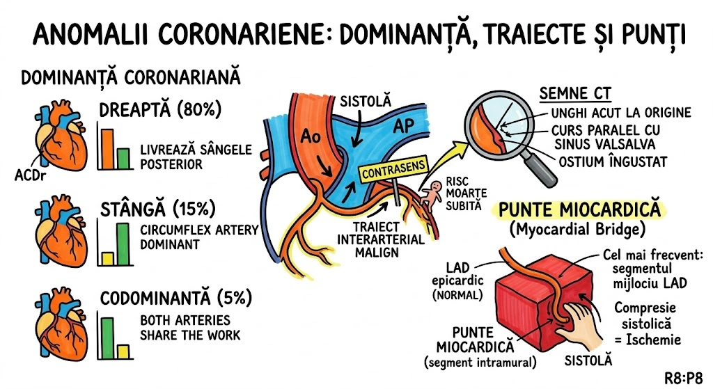 Traiectul interarterial "malign" vs. traiectul retroaortic "benign" e ca diferenta dintre a traversa autostrada pe jos (letal) si a merge pe langa ea pe trotuar (inofensiv). Acelasi concept — originea din sinusul contralateral — dar traseul face toata diferenta. Interarterial = intre Ao si AP = compresie in sistola = risc fatal. Retroaortic = in spatele Ao = fara compresie = benign.