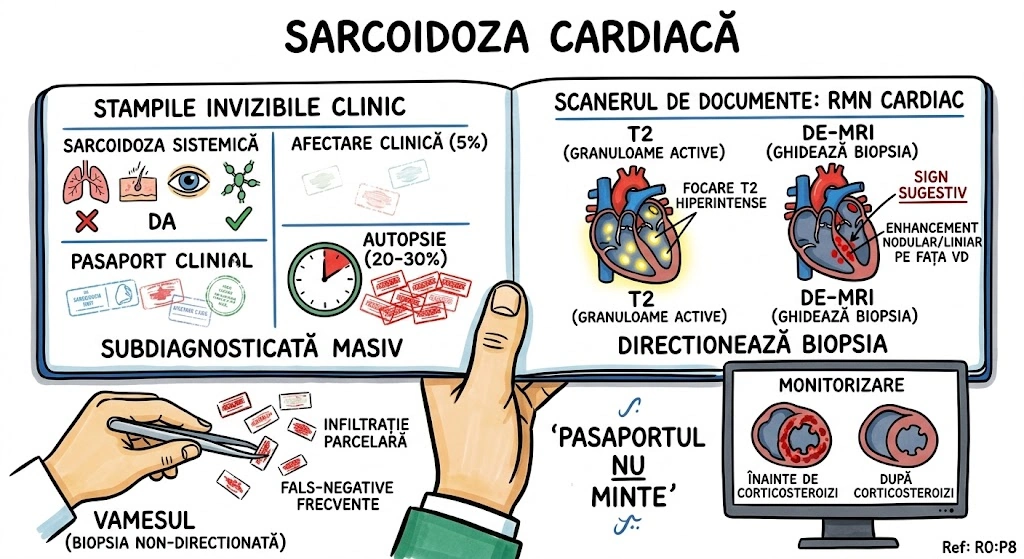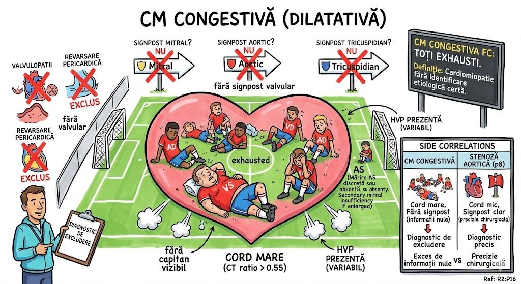 O tabla de sah cu 8 piese, fiecare cu miscarile ei specifice care o diferentiaza de toate celelalte. Regele (Pericardita constrictiva cronica): ≥4 mm, enhancement tardiv, calcificari, sept care face bouncing. Regina (Cardiomiopatia restrictiva): arata similar dar pericardul e normal — enhancement subendocardial, fara calcificari, miscare normala. A le confunda e ca si cum ai confunda regele cu regina in sah — piese diferite cu miscari complet diferite, dar stau pe aceeasi linie. Turnul (CT): stabil, puternic la calcificari. Nebunul (RMN): merge diagonal, vede tot — grosime, caracterizare, fibroza. Pionul (TTE): mic dar vine primul pe tabla. Calul (DE-MRI): sare peste piese, diferentiaza fibroza de inflamatie in mod unic. Cele 10 reguli ale jocului ghideaza mutarile diagnostice.
