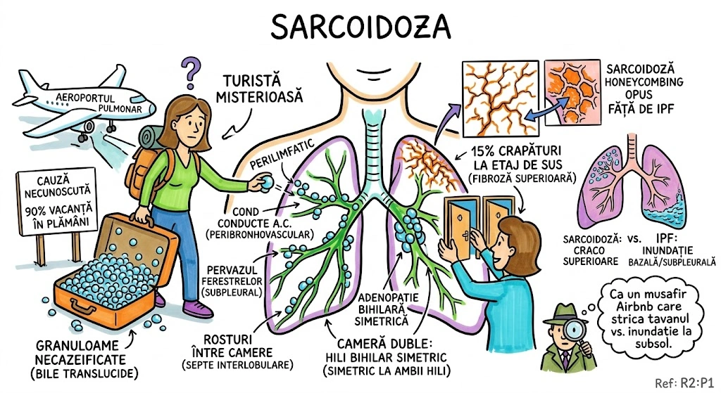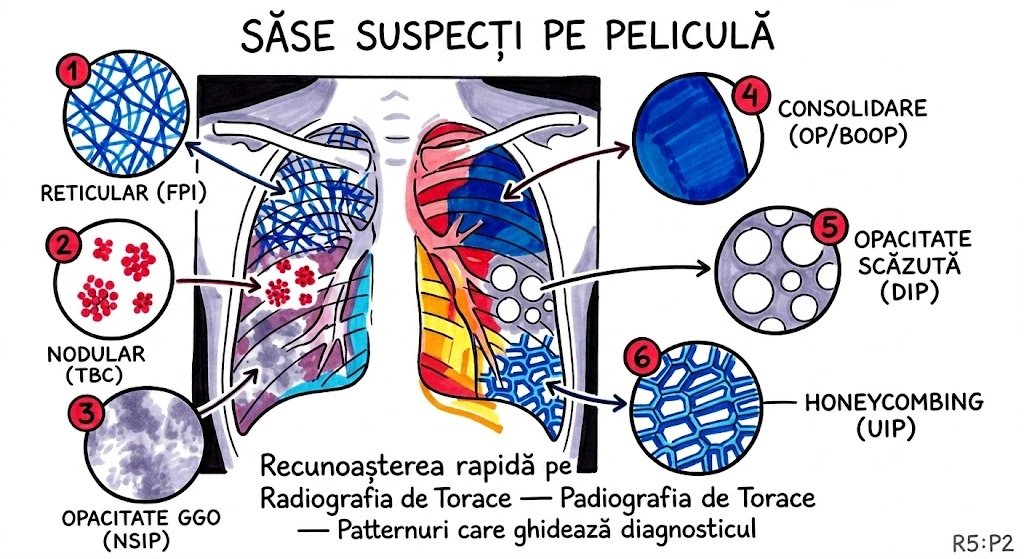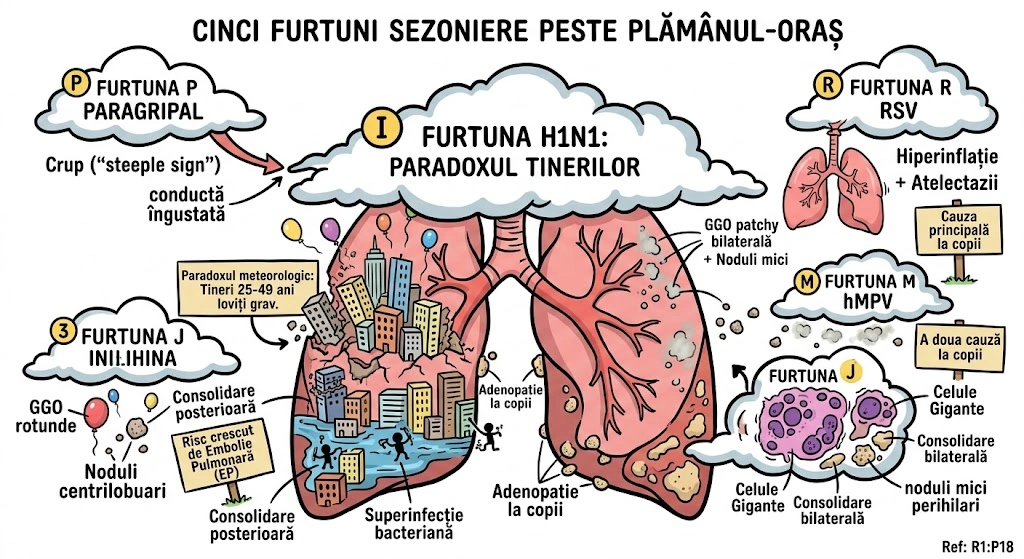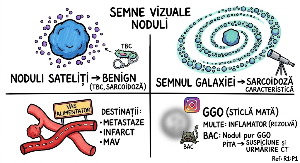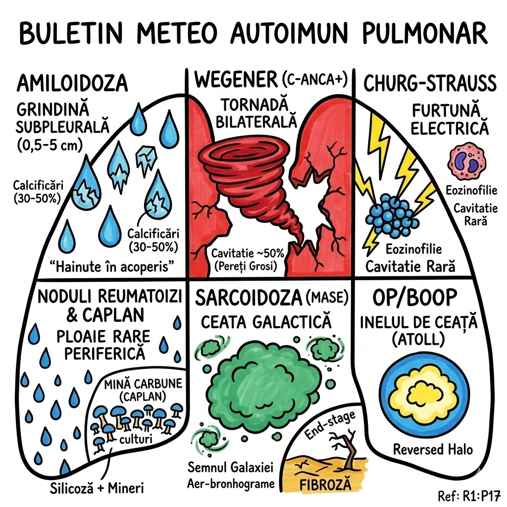 Meteorologul pulmonar prezinta prognoza zilei: „In zona centrala perihilara — furtuna bat-wing cu probabilitate 90% de edem pulmonar. Aripile de liliac se extind bilateral." „La periferie — inghet cronic: eozinofilica clasica, BOOP-ul si sarcoidoza formeaza cristale pe marginile plamanilor." „Precipitatii in pete, neregulate — orice pneumonie poate fi vinovata, plus SDRA si aspiratia." „Grindina nodulara difuza — TBC-ul si CMV-ul imprastie noduli aerospatiali prin arborele bronsic." „Ceata totala omogena — edem masiv, hemoragie sau SDRA. Vizibilitate pulmonara zero." Regula meteo de aur: bat-wing = gandul numarul 1 e edemul; periferic = gandul numarul 1 e boala cronica.