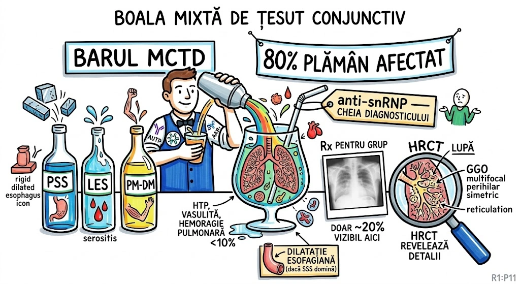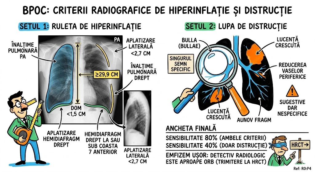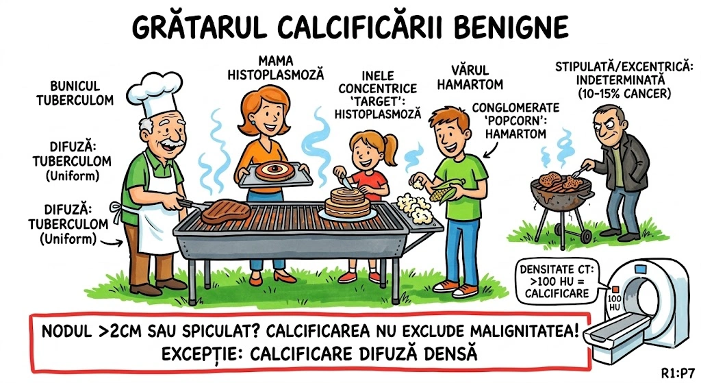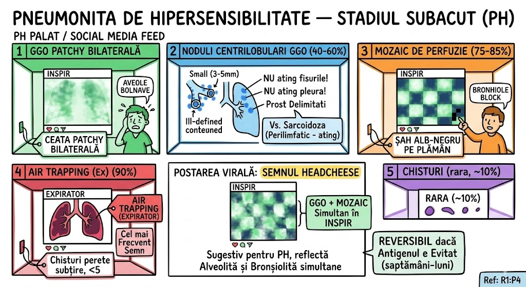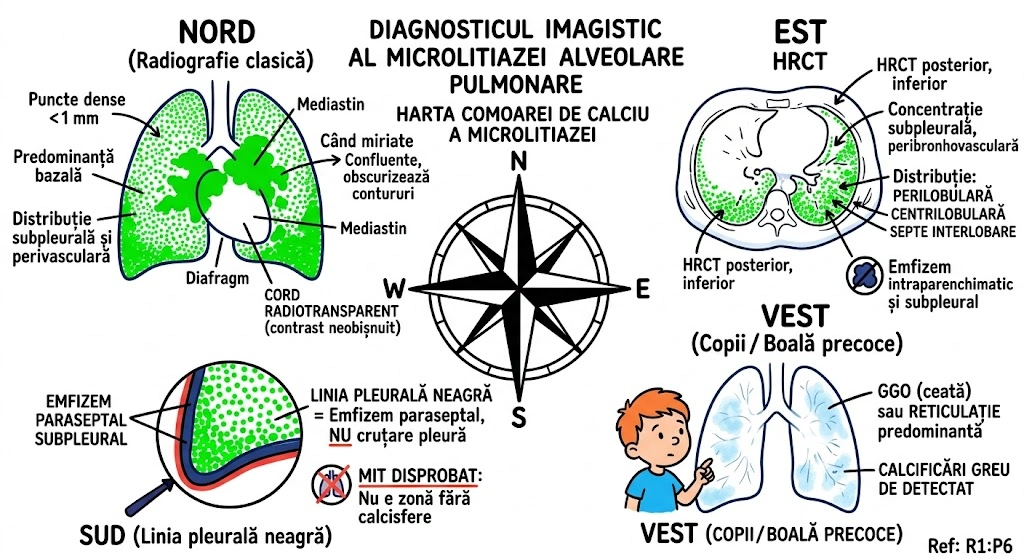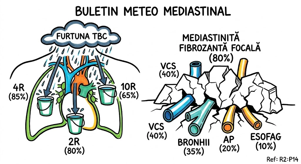 Meteorologul pulmonar prezinta prognoza zilei: „In zona centrala perihilara — furtuna bat-wing cu probabilitate 90% de edem pulmonar. Aripile de liliac se extind bilateral." „La periferie — inghet cronic: eozinofilica clasica, BOOP-ul si sarcoidoza formeaza cristale pe marginile plamanilor." „Precipitatii in pete, neregulate — orice pneumonie poate fi vinovata, plus SDRA si aspiratia." „Grindina nodulara difuza — TBC-ul si CMV-ul imprastie noduli aerospatiali prin arborele bronsic." „Ceata totala omogena — edem masiv, hemoragie sau SDRA. Vizibilitate pulmonara zero." Regula meteo de aur: bat-wing = gandul numarul 1 e edemul; periferic = gandul numarul 1 e boala cronica.