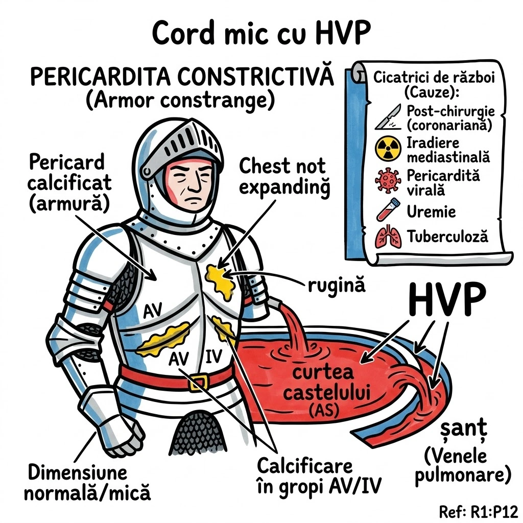 Sahul Pericardic — 8 piese pe tabla, 5 criterii de diferentiere. Regele (Pericardita constrictiva cronica): ≥4 mm, enhancement tardiv, calcificari, sept care face bouncing. Regina (Cardiomiopatia restrictiva): arata similar dar pericardul e normal — enhancement subendocardial, fara calcificari, miscare normala. A le confunda e ca si cum ai confunda regele cu regina in sah — piese diferite cu miscari complet diferite. Turnul (CT): stabil, puternic la calcificari. Nebunul (RMN): merge diagonal, vede tot — grosime, caracterizare, fibroza. Pionul (TTE): mic dar vine primul pe tabla. Calul (DE-MRI): sare peste piese, diferentiaza fibroza de inflamatie. Cele 10 reguli ale jocului: (1) TTE prima. (2) CT = calcificari. (3) RMN = grosime + caracterizare. (4) Constrictiva vs. restrictiva = 93%. (5) Bouncing septal pe cine. (6) DE-MRI: tardiv = fibroza, precoce fat-sat = inflamatie. (7) Hemoragic: >40-45 UH. (8) Chisturi nu enhanceaza. (9) Melanom = T1 inalt. (10) Absenta pericard = plaman in fereastra aortopulmonara.