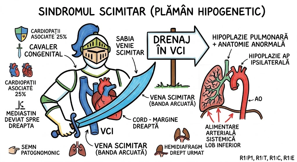 O sabie curbata (scimitar) ascunsa in pieptul unui cavaler congenital. Sabia (vena scimitar) este o banda arcuata larga, vizibila pe radiografie, paralela cu marginea dreapta a inimii, extinzandu-se pana la diafragm — imagine patognomonica. Sabia dreneaza sangele pulmonar in directia gresita: in loc de atriul stang, il duce la VCI (sau la atriul drept, sau la venele hepatice). Cavalarul are patru probleme: (1) plamanul drept e mic si dezorganizat (hipoplazie + anatomie anormala), (2) artera pulmonara dreapta e subtire (hipoplazica), (3) sabia curbata dreneaza sangele gresit (drenaj venos anomal), (4) lobul inferior primeste sange de la aorta in loc de artera pulmonara (alimentare arteriala sistemica). In 2/3 din cazuri, sabia dreneaza intregul plaman drept. 25% au cardiopatii congenitale (DSA, canal arterial persistent). Solutia: reimplantarea sabiei (vena anomale) in atriul stang.