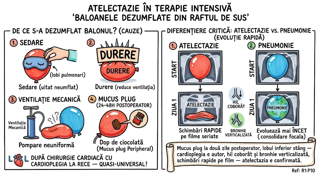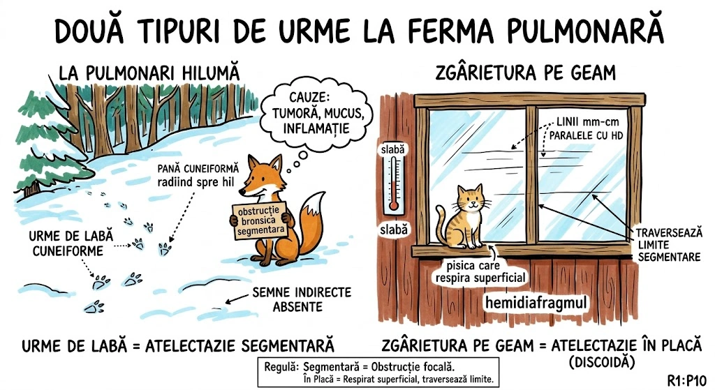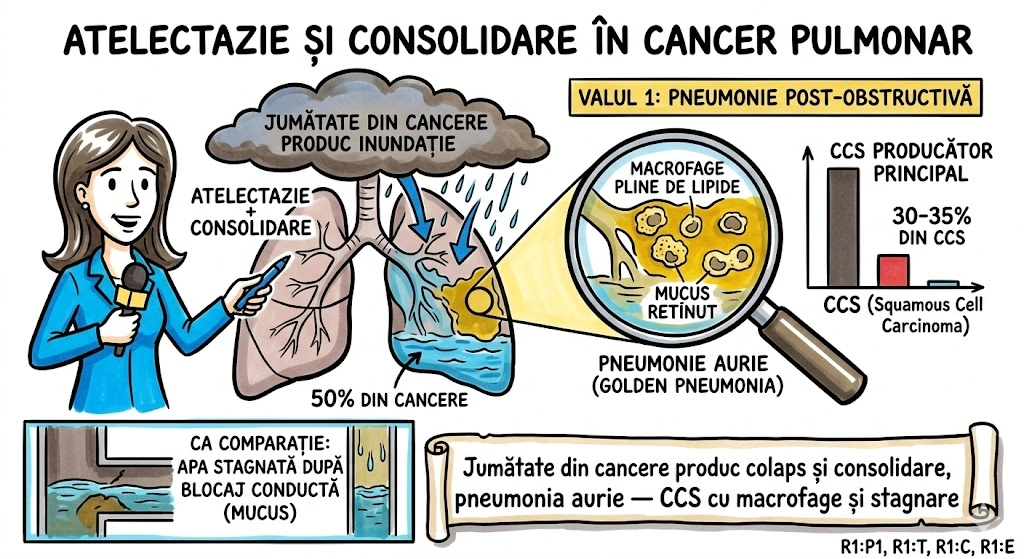 Gandeste-te la un burete de bucatarie. Buretelui (plamanul) i se pot intampla doua lucruri rele: fie il imbiba cineva cu apa, ulei sau sos (consolidare — structura ramane, aerul e inlocuit cu altceva), fie il storci si il comprimi sub o oala grea (atelectazie — pierde volum, se face mic si dens). Pe radiografie ambele arata ca o „pata alba" — trucul e sa intelegi daca buretelui i s-a schimbat continutul sau i s-a schimbat dimensiunea. Instrumentele de investigatie: Rx (PA/AP/lateral), CT si HRCT.