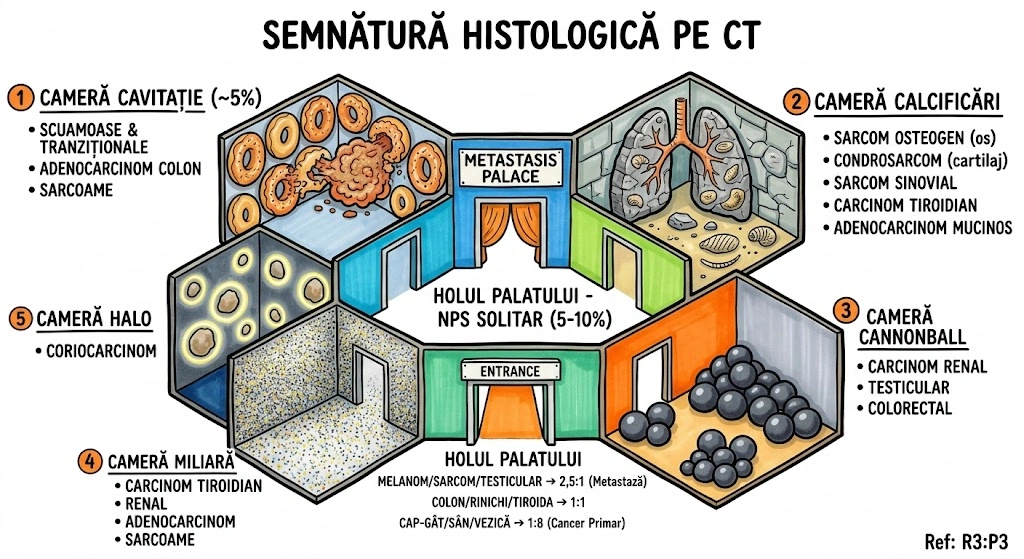 🥊 Ringul Comparatiilor: CCAM e ca un bloc de apartamente cu defecte structurale — chistul bronhogenic (p5) e o singura garsoniera gresit construita in alta parte a orasului. Diferenta fundamentala: CCAM e multichistica, dezorganizata, cu comunicare cu arborele bronsic si vascularizatie pulmonara; chistul bronhogenic e solitar, bine delimitat, fara comunicare. CCAM vine cu risc de malignizare pe termen lung — chistul bronhogenic nu.
