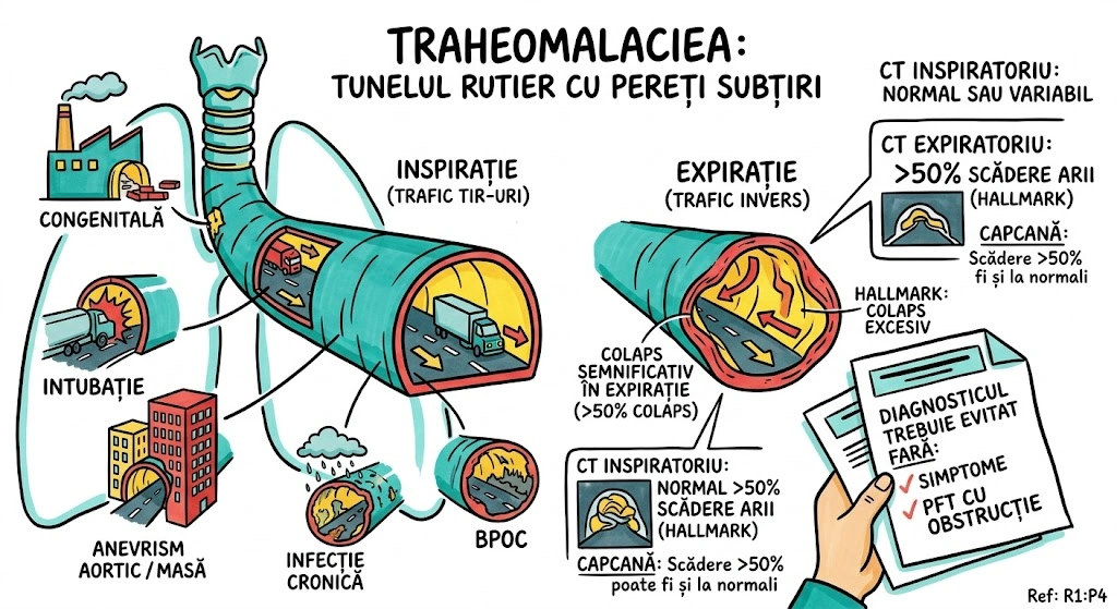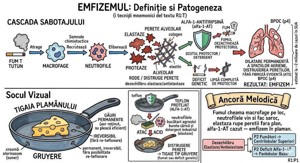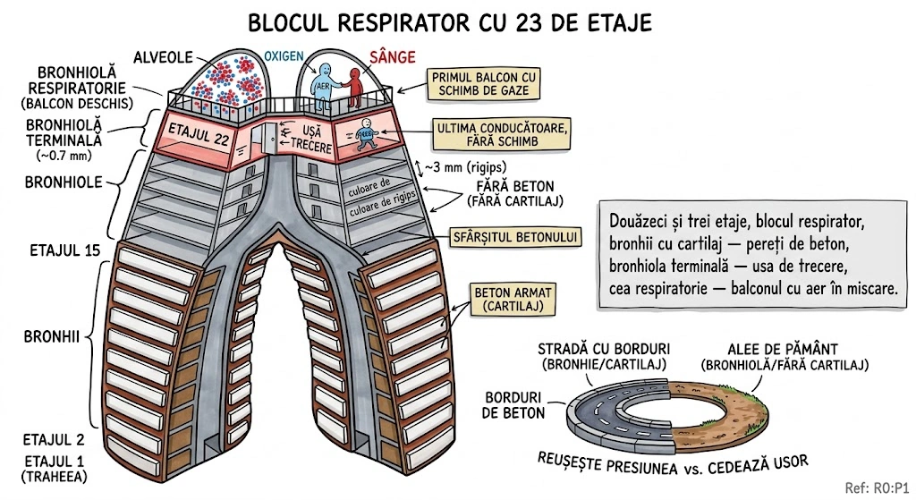 🥊 Ringul Comparatiilor: Atrezia bronsica e ca un drum national blocat de la constructie, unde gunoiul se acumuleaza dar aerul gaseste rute ocolite — spre deosebire de emfizemul lobar congenital (p4) unde drumul nu e blocat complet, ci are o bariera cu sens unic (obstructie de tip supapa — aerul intra dar nu mai iese). Ambele produc hiperinflatie, dar mecanismul si varsta la care deranjeaza sunt diferite.