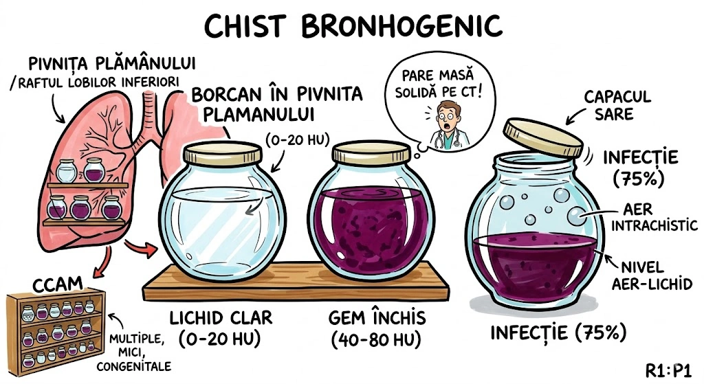 Un borcan uitat in pivnita plamanului — pus acolo in gestatie si niciodata deschis. Borcanul (chistul) e tapetat pe interior cu un material special (epiteliu ciliat pseudostratificat columnar) si peretele e atat de subtire incat uneori nici nu il vezi pe CT. Ce contine borcanul? Depinde de ce s-a conservat: (a) Lichid clar — 0-20 HU, jumatate din borcane arata asa; (b) Gem inchis la culoare — 40-80 HU, continut proteic sau hemoragic, pare masa solida pe CT si pacaleaste radiologul; (c) Lapte de calciu — densitate crescuta, extrem de rar. Borcanul sta linistit pe raftul plamanului medial, de regula la lobii inferiori. Problema: in 75% din cazuri borcanul se infecteaza — creste brusc in dimensiuni, isi pierde conturul net, iar capacul sare (apare aer intrachistic sau nivel aer-lichid).