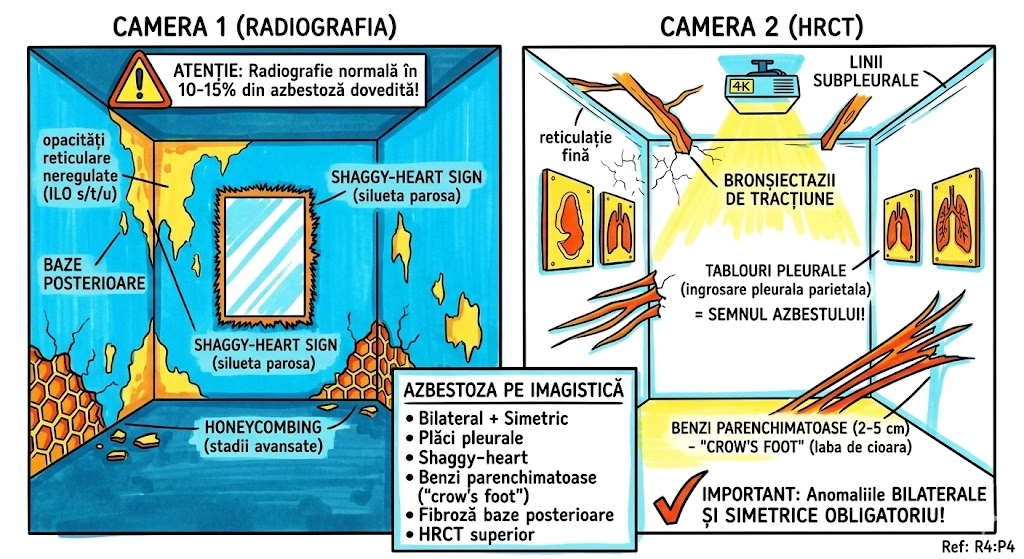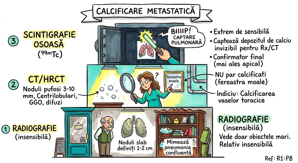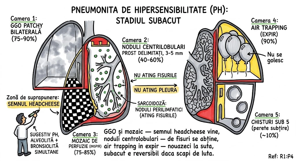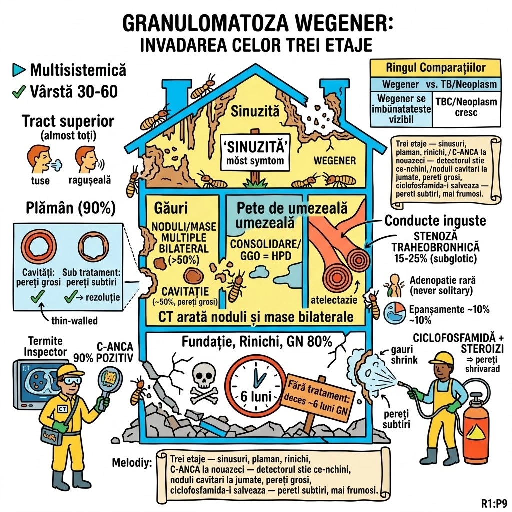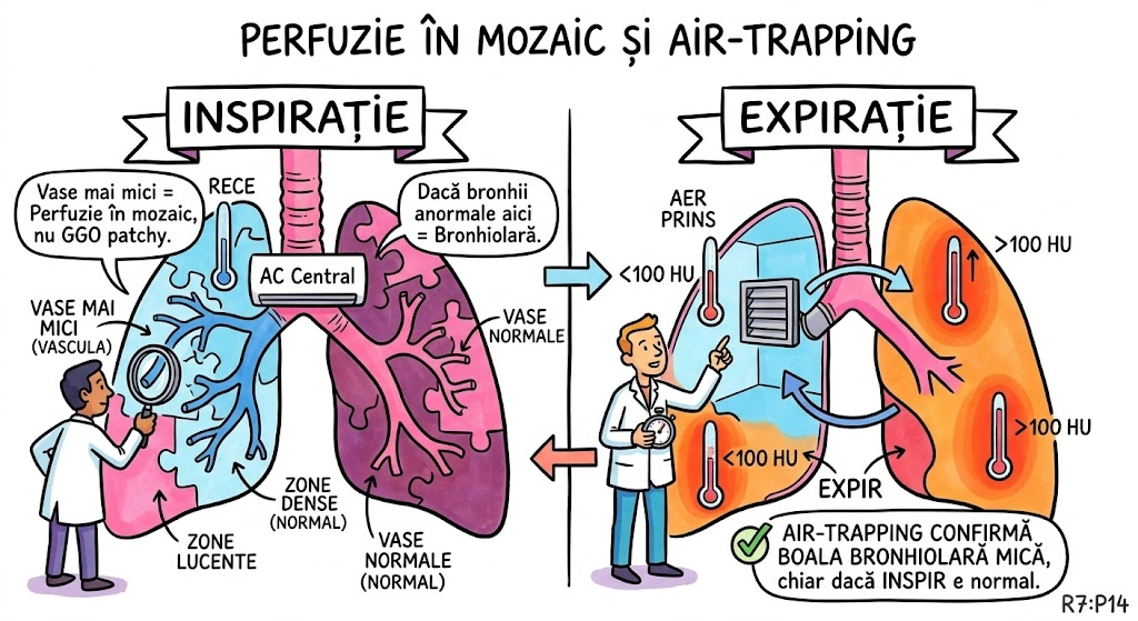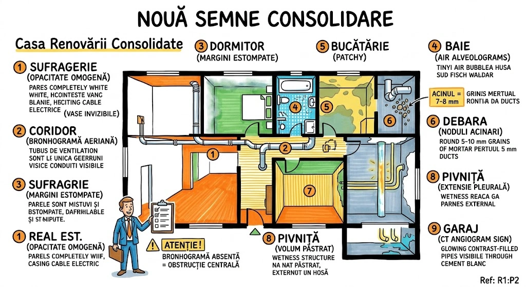 O casa cu noua camere, fiecare cu o problema specifica de renovare. Camera 1 (Sufrageria opaca): peretii vopsiti complet in alb — vasele (cablurile electrice) nu se mai vad. Camera 2 (Coridorul aerisit): singurele conducte vizibile in toata casa alba sunt cele de aer — bronhograma aeriana. Camera 3 (Pereti cetosi): marginile camerelor sunt estompate, neclare. Camera 4 (Bule sub tapet): mici pete de aer ramase captive — air alveolograms. Camera 5 (Pete de umezeala): consolidare variabila, opacitati in pete. Camera 6 (Bile de mortar): granulatii rotunde prost delimitate, 5–10 mm, distributie centrilobulara — nodulii acinari. Camera 7 (Volumul casei neschimbat): volumul se pastreaza. Camera 8 (Umezeala la pereti exteriori): procesul ajunge pana la pleura. Camera 9 (Teava prin ciment): dupa contrast IV, vasele stralucesc mai puternic decat parenchimul consolidat — semnul CT angiograma. Nota: daca nu vezi tubulatura de ventilatie in coridor (bronhograma absenta), cineva a blocat intrarea — obstructie centrala probabila.