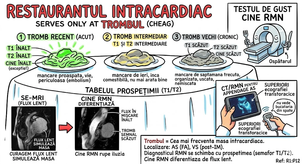 Restaurantul Intracardiac are un singur preparat — trombul — dar in trei variante de prospetime. Farfuria zilei (tromb recent): T1 inalt, T2 inalt — mancarea straluceste, e proaspata, periculoasa (embolism iminent). Farfuria de ieri (tromb intermediar): T1 si T2 intermediare — mancarea e inca comestibila dar nu mai arata bine. Farfuria de saptamana trecuta (tromb vechi): T1 scazut, T2 scazut — totul e inchis, organizat, uscat, nemiscat. Ospitarul (radiologul) trebuie sa evalueze prospetimea. Cine RMN e testul de gust: trombul sta pe farfurie (semnal scazut), sangele curge pe langa (semnal inalt). Dar flux lent in appendagele AS la un pacient cu FA poate semana cu trombul pe SE — e "mancarea falsa" — Cine RMN il demascheaza. CT si RMN sunt superiori ecografiei transtoracice pentru appendagele AS.