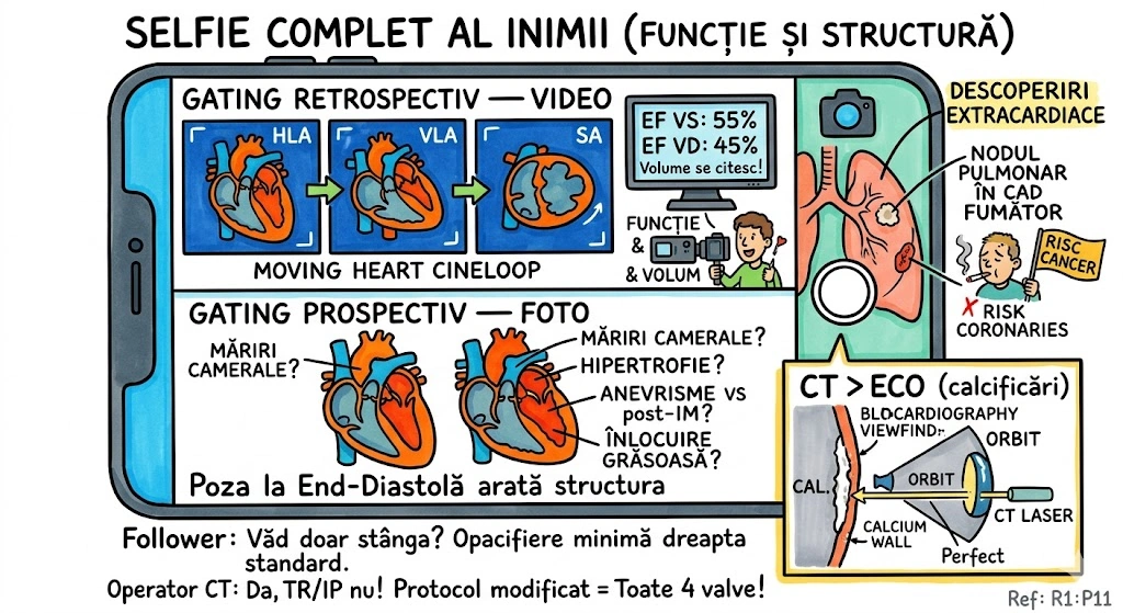Gating prospectiv vs. retrospectiv e ca diferenta dintre a face o poza cu telefonul (click rapid, baterie putina) vs. a filma tot evenimentul si apoi sa extragi screenshot-uri (filmare completa, baterie multa). Poza unica e suficienta cand vrei doar anatomia. Filmul complet e necesar cand vrei sa vezi si cum functioneaza inima in miscare.